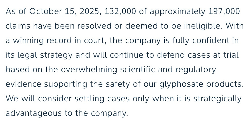 Monsanto-Bayer has lost some cases and won some and settled with most claimants, spending $10 billion dollars so far, while about 60,000 cases remain outstanding.