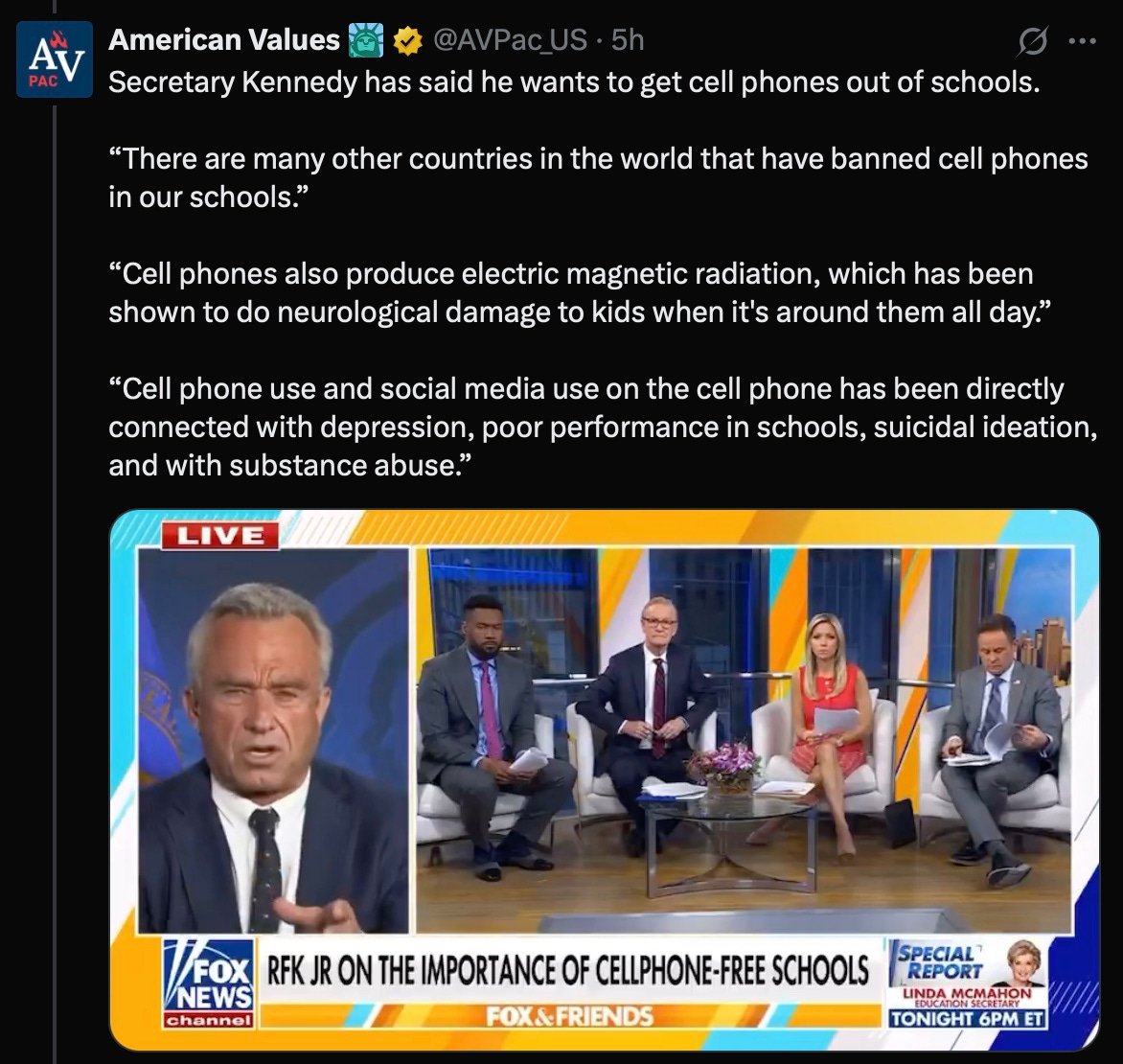 19 states already ban cell phones in schools. Sec. Kennedy calls for the rest to do soMeryl NassMar 20, 20251497817Sharehttps://x.com/AVPac_US/status/1902755592801759575PreviousNext
