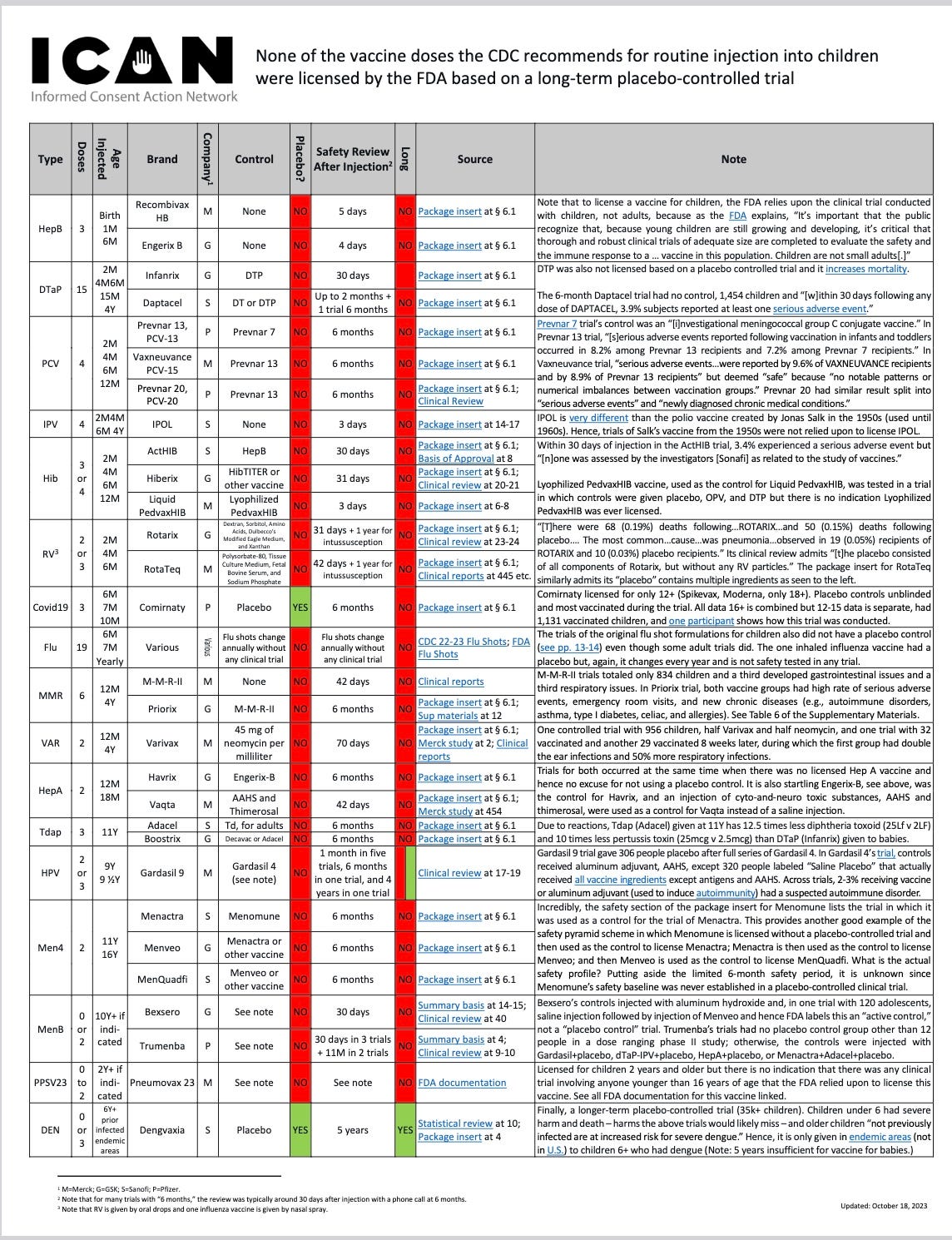 ICAN’s collection on how all the childhood vaccines were studies before approval. It turns out none had a long-term safety study using a true placebo. This is mind-boggling. Vaccinology appears to be a religion, not a science. ICAN and Aaron Siri have now collected all the data and can prove it.