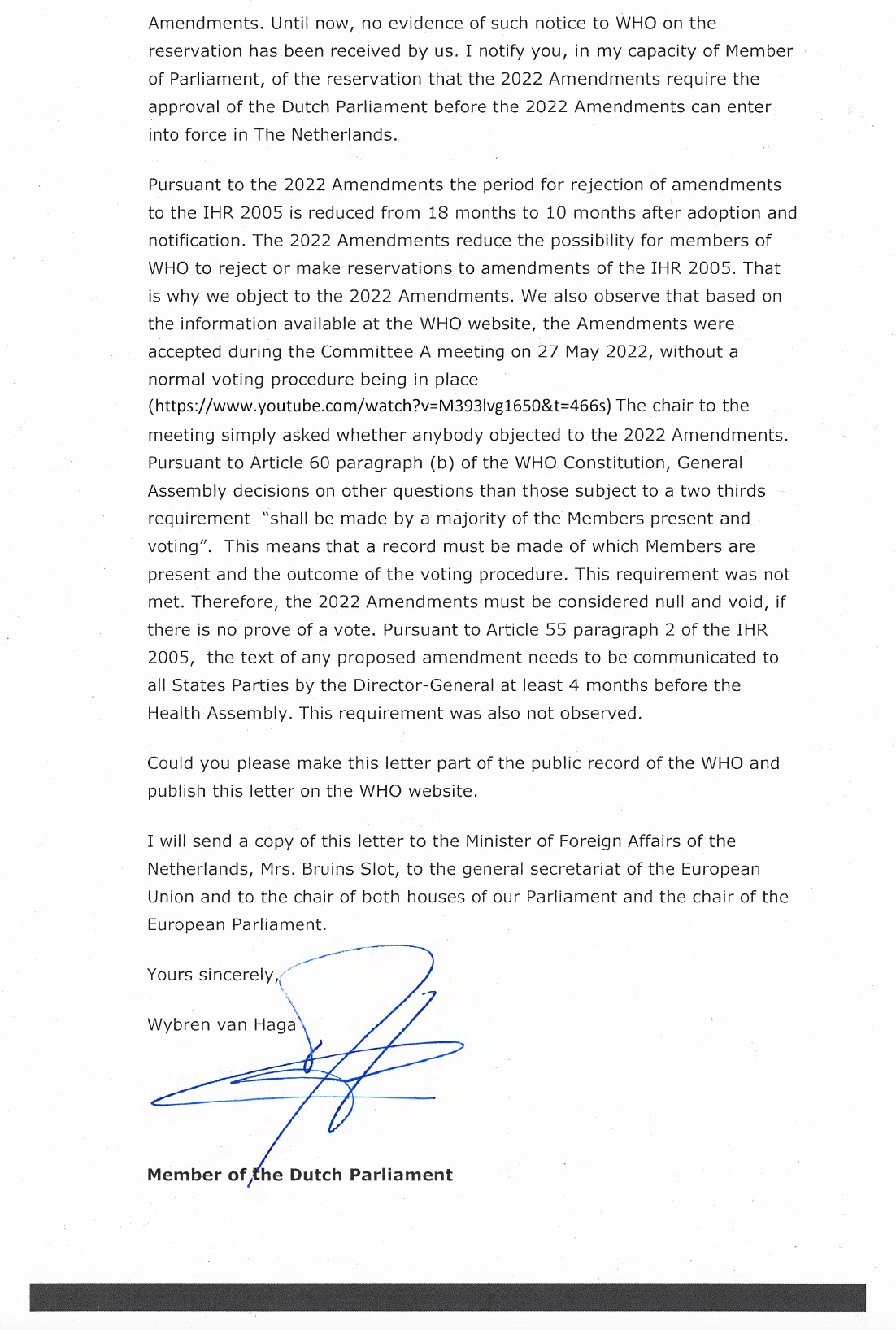 A member of the Dutch Parliament has challenged the WHO's procedures when the May 2022 amendments were approved