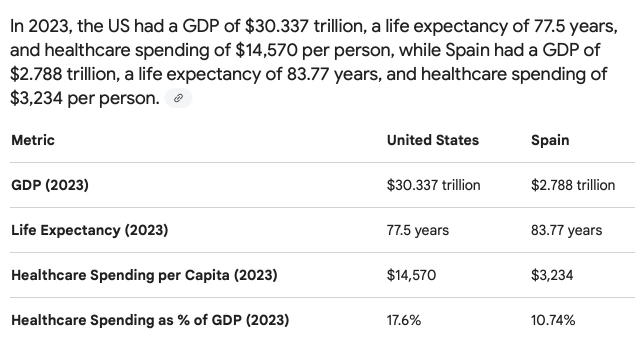 Spaniards lived, on average, more than 6 years longer than Americans but spent less than 1/4 (only 22%) of what we spend on “healthcare.”