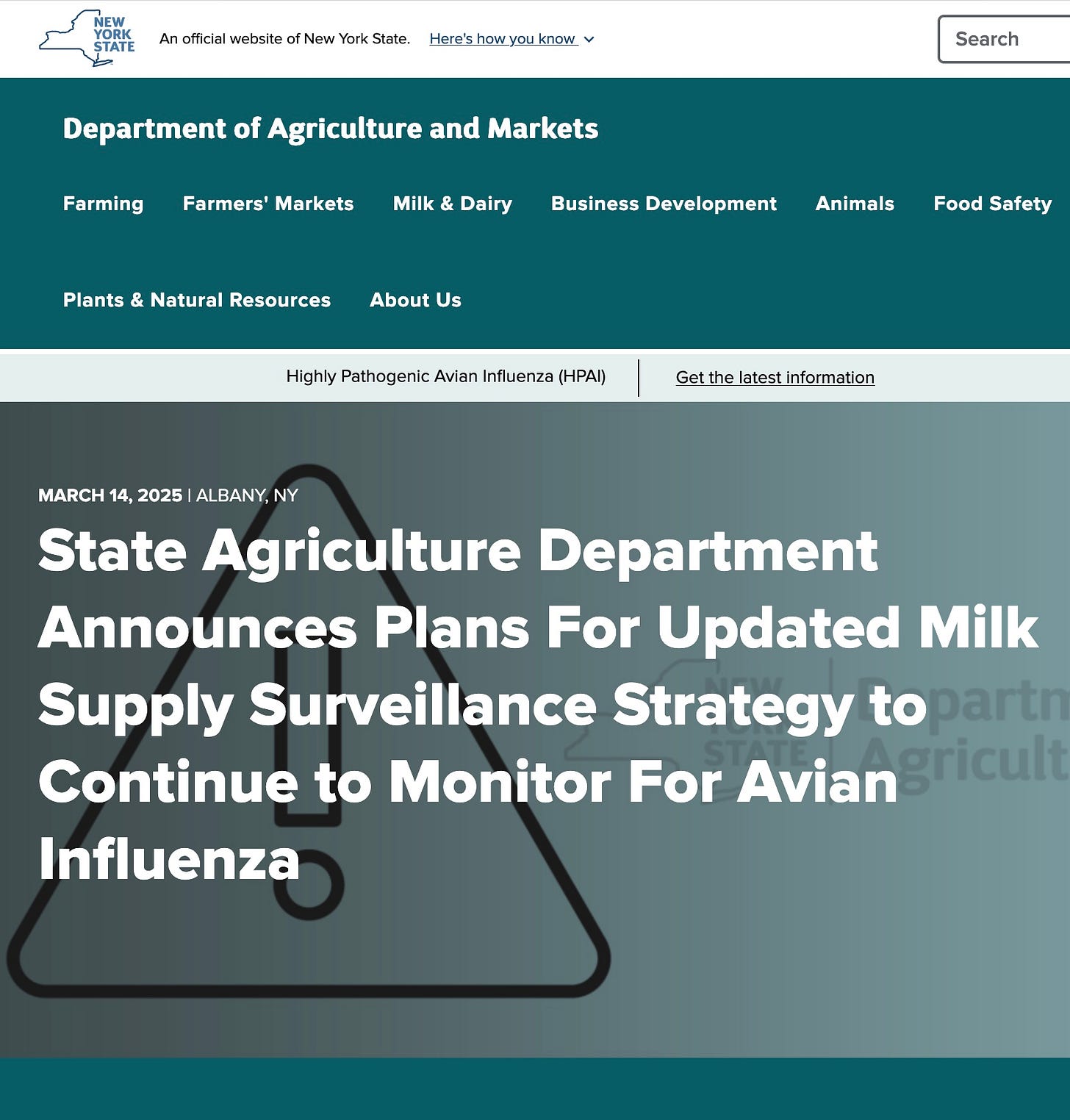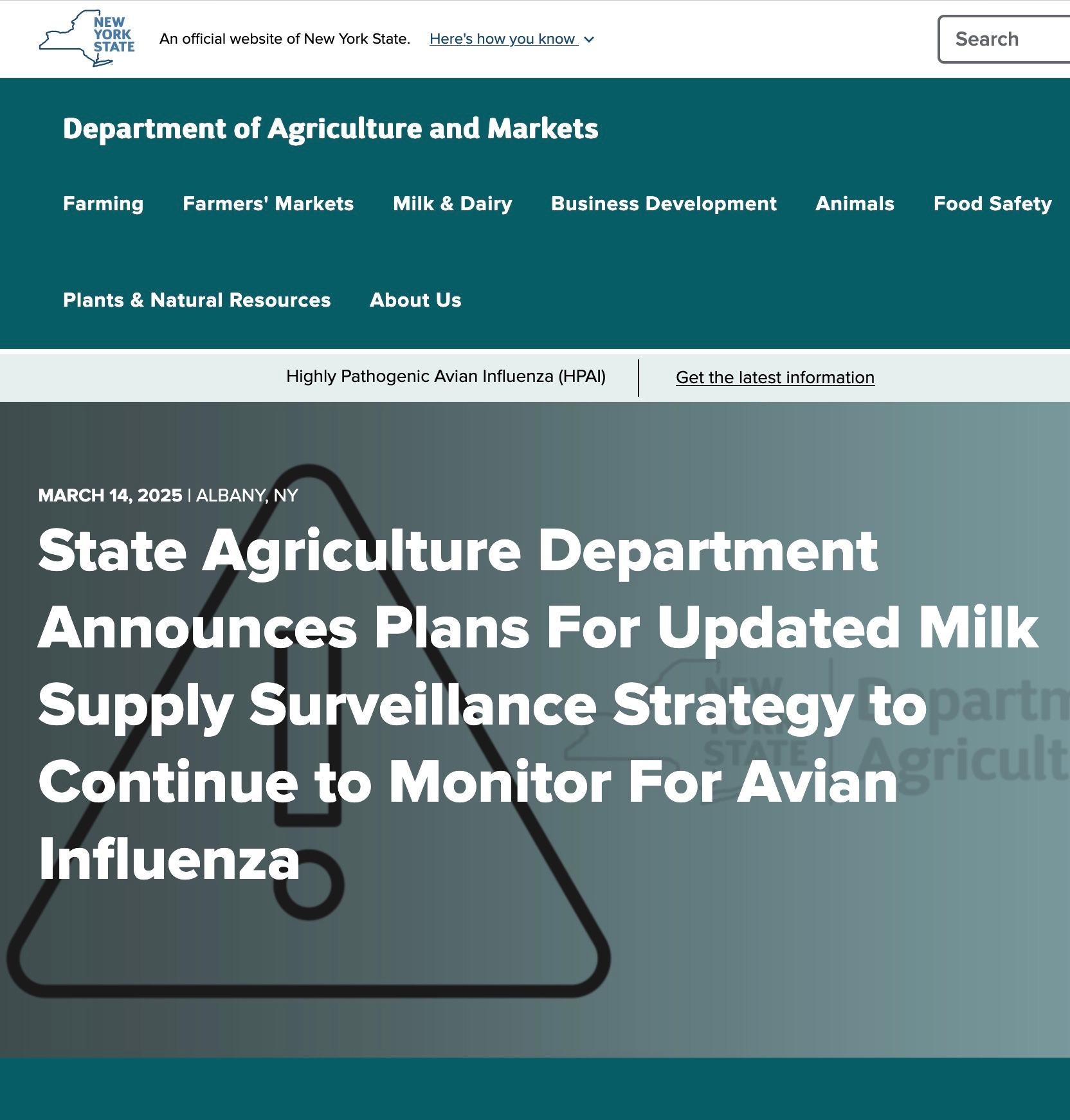 The New York State Department of Agriculture and Markets (Department) today announced that it is working together with the United States Department of Agriculture (USDA), US Food and Drug Administration (FDA), the National Association of State Departments of Agriculture (NASDA), the National Association of Dairy Regulatory Officials (NADRO), and state partners to actively develop an updated surveillance strategy for the milk supply being used in raw milk cheese processing to facilitate the early detection of potential highly pathogenic avian influenza (HPAI) virus. This follows the release of preliminary results of research conducted by Cornell University, commissioned by the Department and FDA, which suggest that HPAI may survive the 60-day aging process in some varieties of raw milk cheese that is made with raw milk containing HPAI.