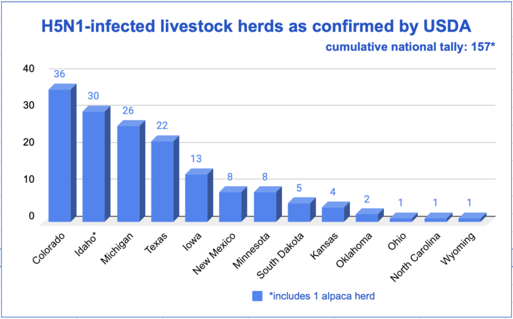 As of Monday, the USDA had listed 157 herds in 13 states as having tested positive for H5N1 since the outbreak was first confirmed in late March.