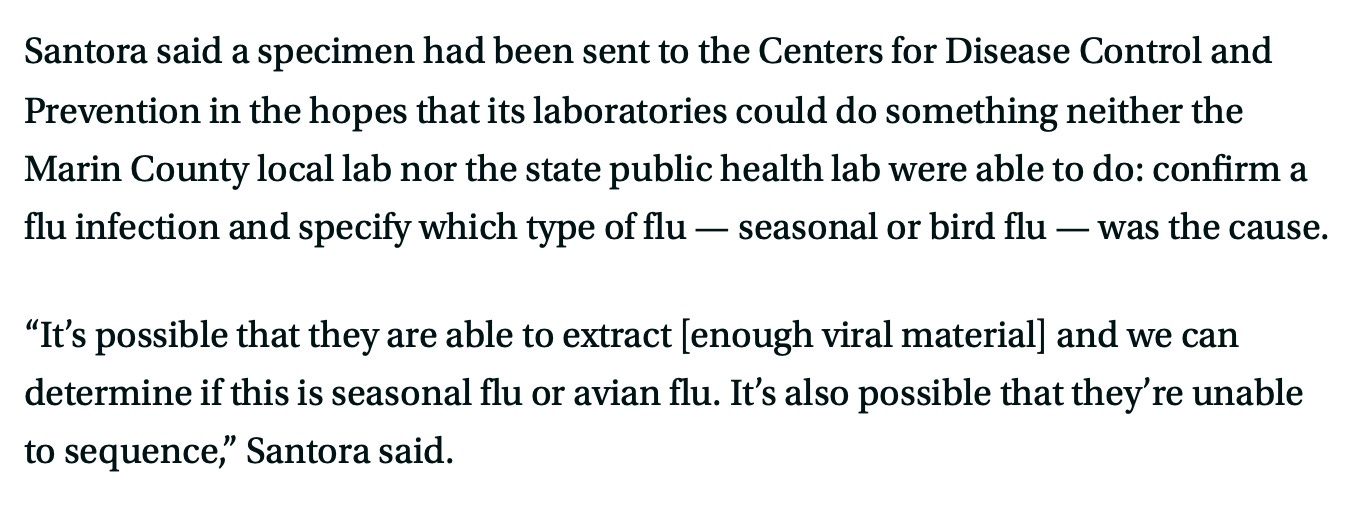 Addendum December 13, 2024: Damn, we could not find evidence of bird flu or any flu no matter how hard we tried. The state lab could not find it. CDC could not find it. The national publicity rested on a county lab’s thinking it found influenza A—which happens all the time. That is how desperate the feds are to blame H5N1 in humans on raw milk. And BTW there is no evidence the baby’s acute illness had anything to do with raw milk, either. From today’s STAT: