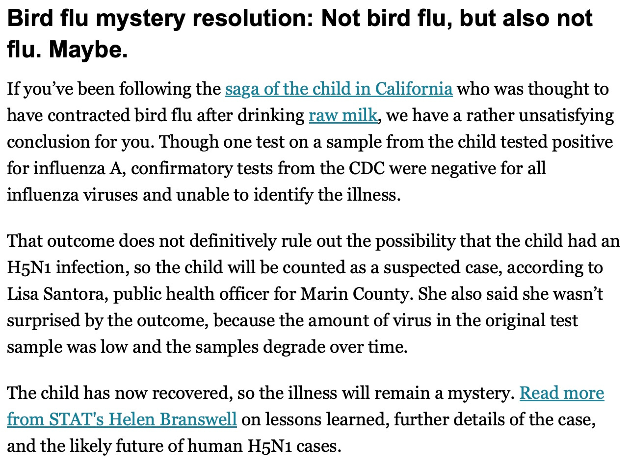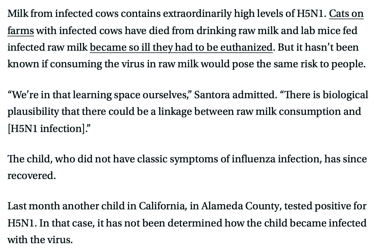 Addendum: From today’s STAT (the entire article is behind a paywall I refuse to pay for, but reader provided it) is an acknowledgement that FDA and California’s gazillion dollar attempt to pin a bird flu infection on raw milk has fizzled, since the toddler could have had any kind of flu. Unless the CDC pulls a rabbit out of a hat, and 5 weeks before the inauguration I doubt anyone there would be willing to do so…