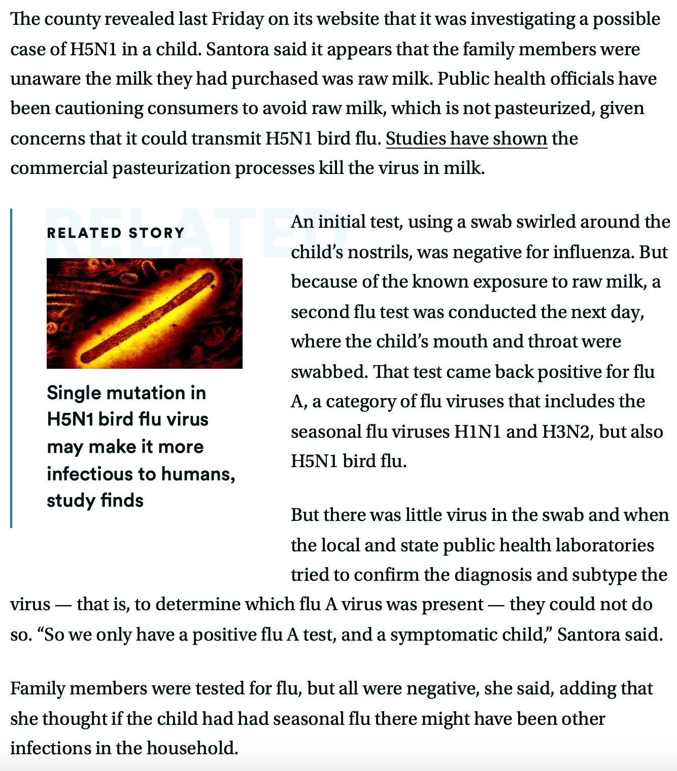 If this child, who has not been identified, is confirmed to have been infected with H5N1 through milk consumption, it will be the first such case recorded in the United States. But Lisa Santora, public health officer for Marin County, acknowledged to STAT there is a decent chance the infection will not be confirmed.