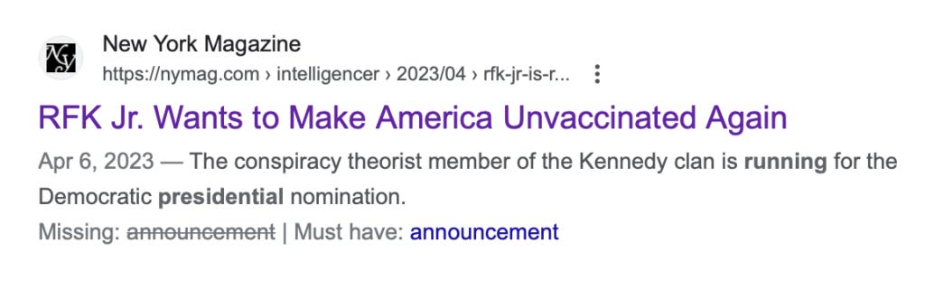 Of course, Yahoo News, and all the rest of the in-the-tank news media greeted Robert F. Kennedy, Jr.’s presidential announcement by branding him a “noted-anti-vaxxer,” as if that’s a bad thing. Yes, noted, thank you very much. Reuters elaborated: “Kennedy has been banned from YouTube and Instagram for spreading misinformation about vaccines and the COVID-19 pandemic.” By now, whenever you see the agit-prop platitude spreading misinformation, does your brain not instantly translate that into telling the truth? And by now, does banishment from social media not tell you that certain guilty parties recognize a truth-teller when they see one?