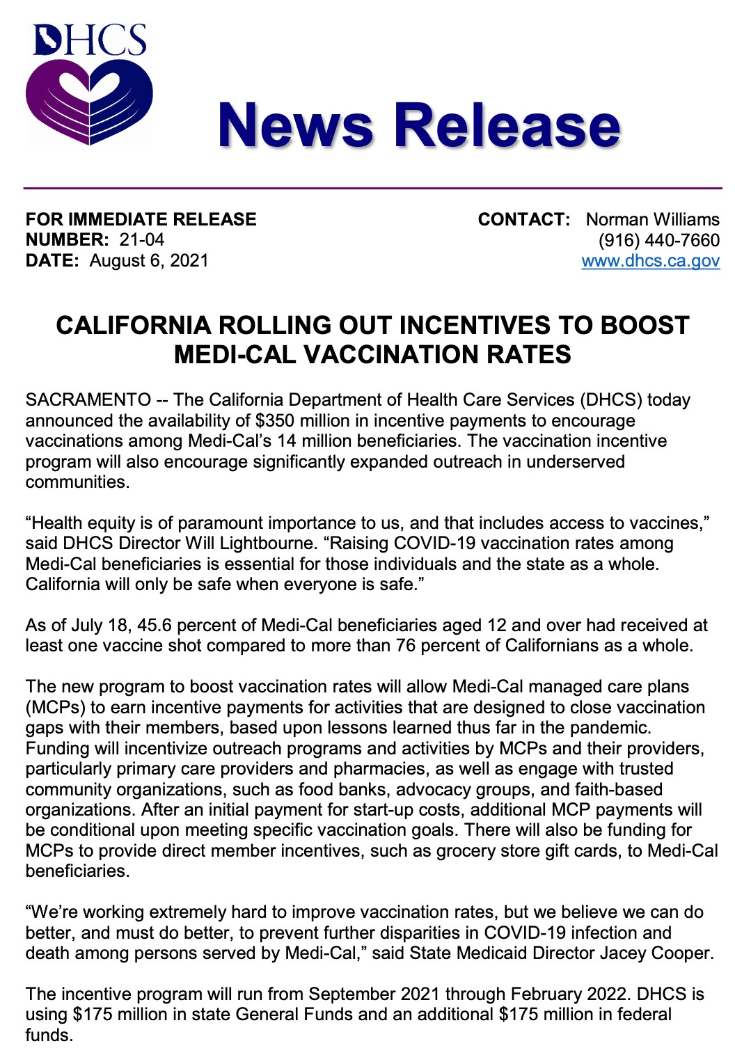 "California will only be safe when everyone is safe." said the DHCS Director.