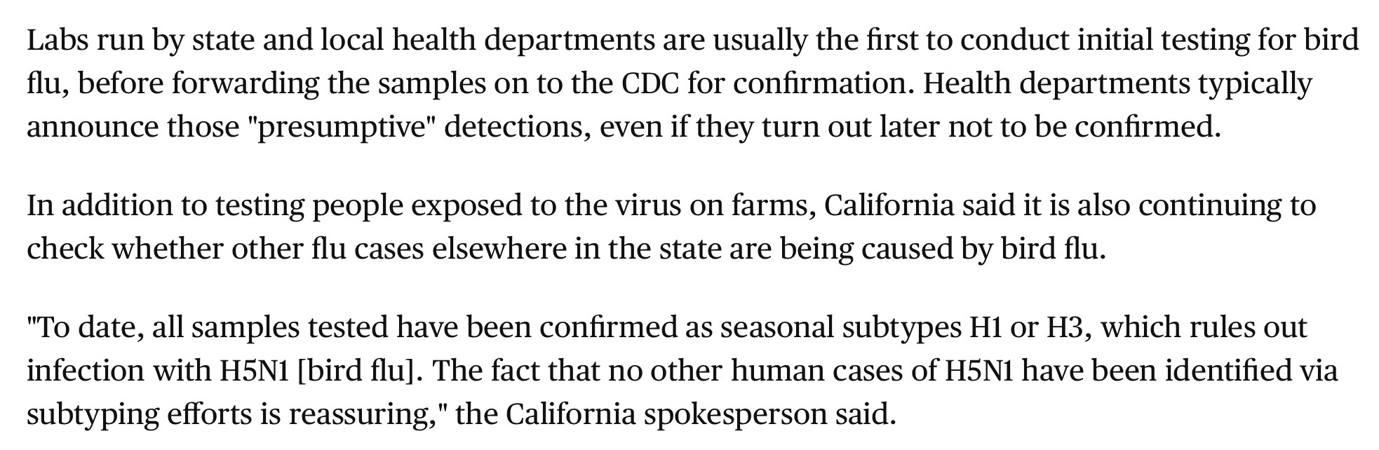 Fleetwood implied that local health departments do not correct the record when their initial positive tests for bird flu turn out to be false positives. But in fact, California DID announce that its case of presumed bird flu in a child that drank raw milk was not confirmed by either the state nor the federal CDC, and had been falsely deemed positive.