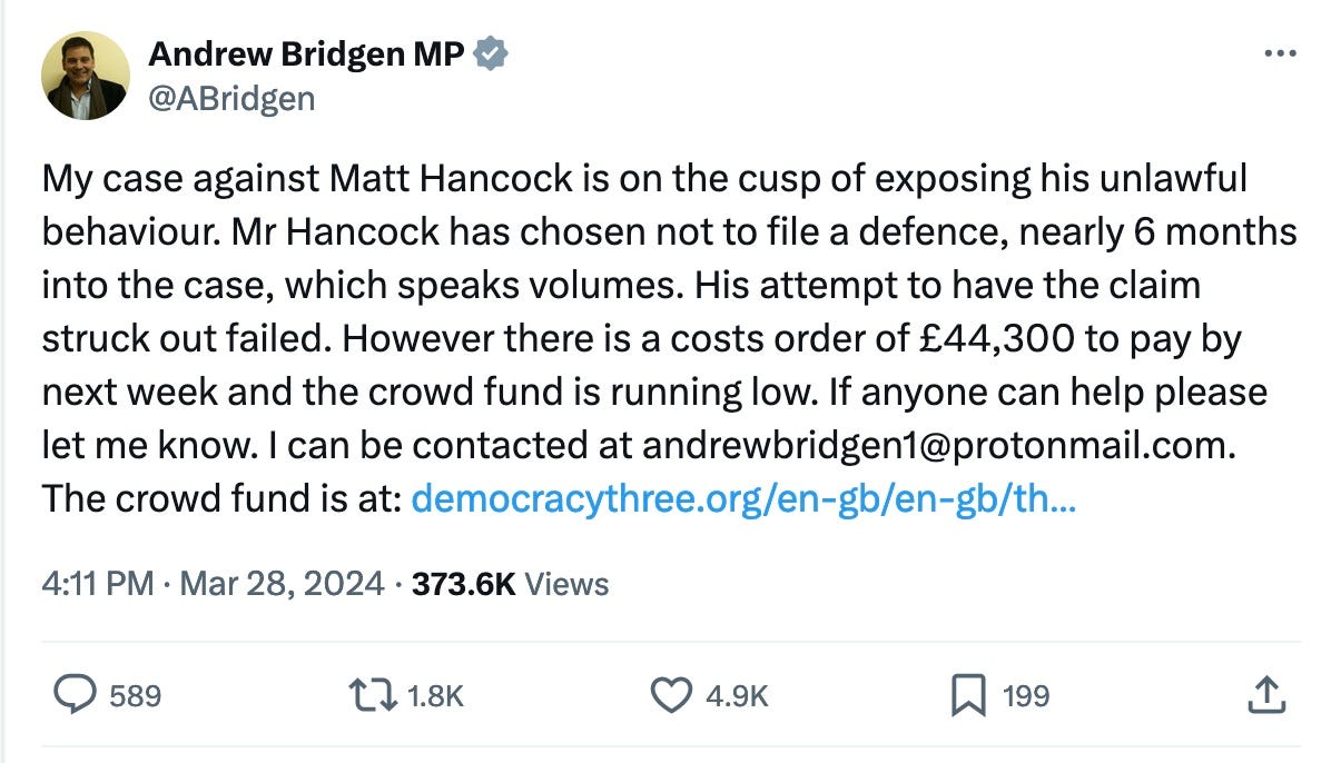Can you help Andrew Bridgen sue Matt Hancock for his COVID crimes and lies? The case can't go forward without costs being paid.