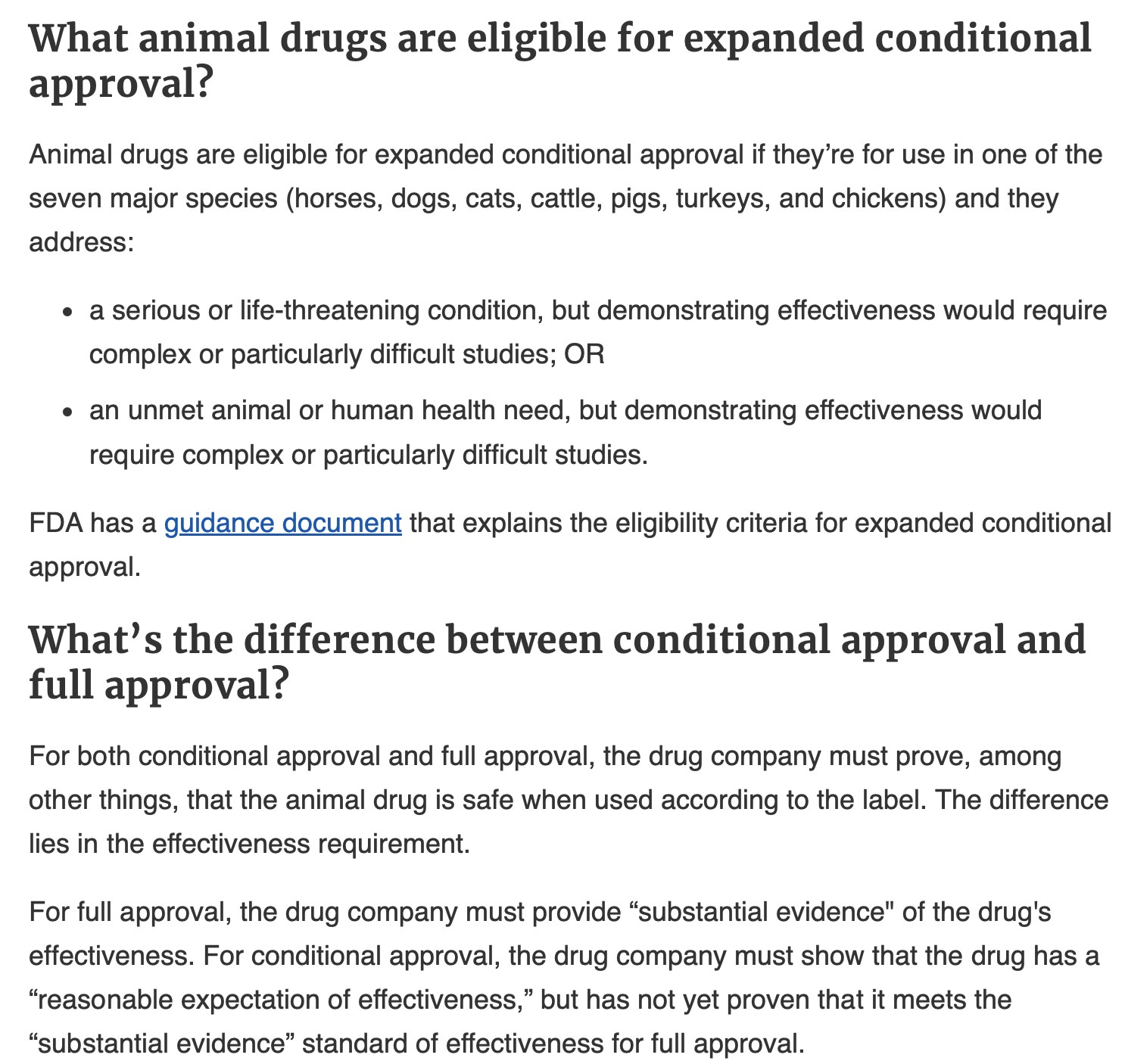 FDA’s conditional approval allows the drug company to legally sell the animal drug before proving it meets the “substantial evidence” standard of effectiveness for full approval. The company can also legally promote and advertise the conditionally approved drug for the labeled uses.