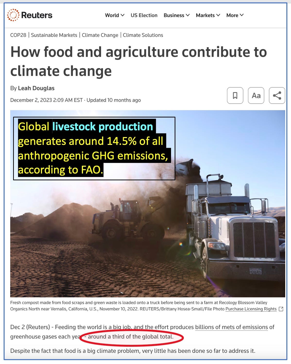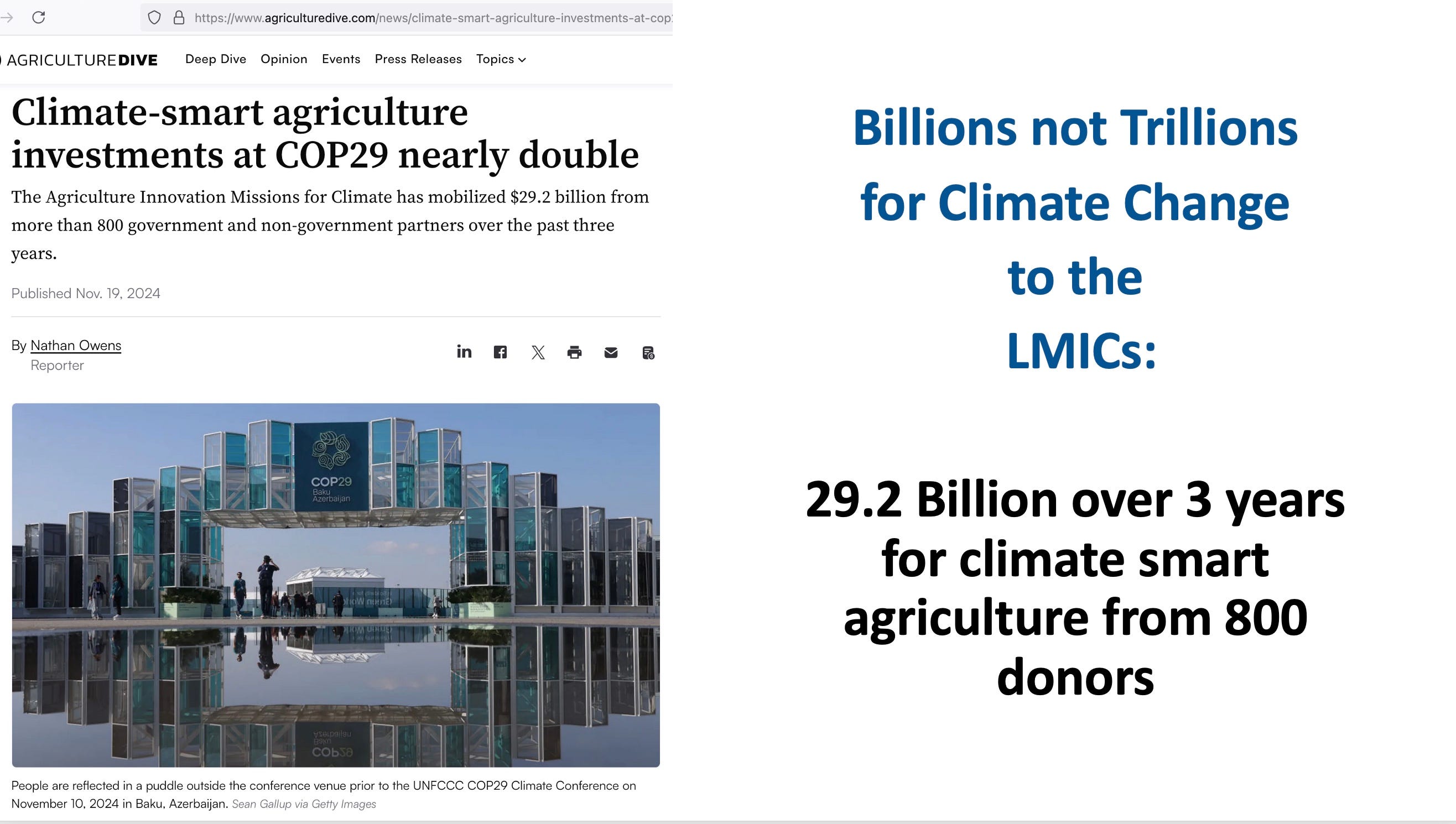 Even though the international “experts” claim that agriculture contributes to 33% of global warming emissions, with livestock alone contributing nearly half of that, agriculture only got a pittance. But if agriculture causes a third of global warming, shouldn’t it receive a third of the promised climate funding? $10 Billion/yr is less than 1% of $1.3 trillion, and is 4% of $250 billion/yr.