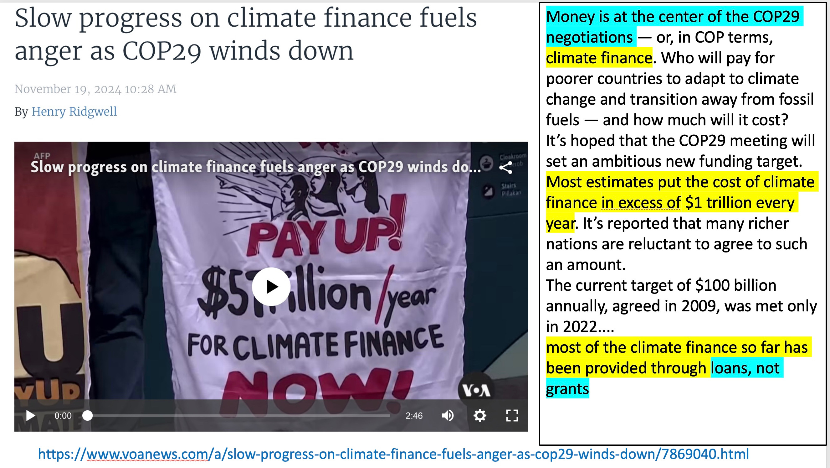 The COP29 meeting was to have ended at 6 pm in Baku, Azerbaijan today, but the nations could not come to an agreement on how much money would be promised to the low and middle income countries (LMIC), so the meeting is continuing into the night. It is already after 1 am on the 23d in Baku.