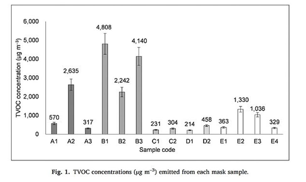 The figure comes from a South Korean study shared on the U.S. National Institutes of Health (NIH) website. The sample with the highest amount of TVOCs had 4,808 microgram per cubic meter, which is about 4.8 parts per million–more than eight times the Environmental Protection Agency’s (EPA) recommended limit of 0.5 parts per million in indoor air. Tight-fitting disposable masks are much worse than cotton masks.