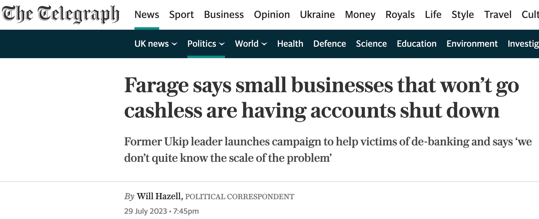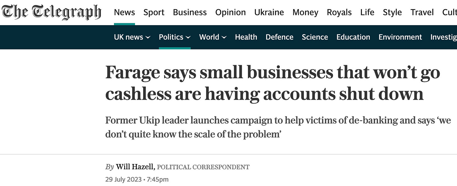 De-banking used as a hammer to force businesses to go cashless or go under/ The Telegraph