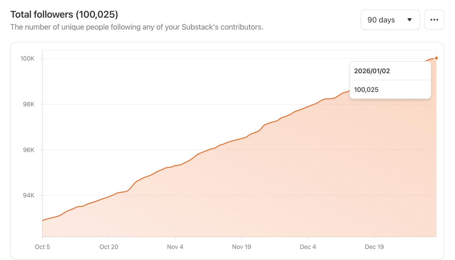 Desperately seeking something to be happy about in 2026, my Substack just achieved 100,000 followers