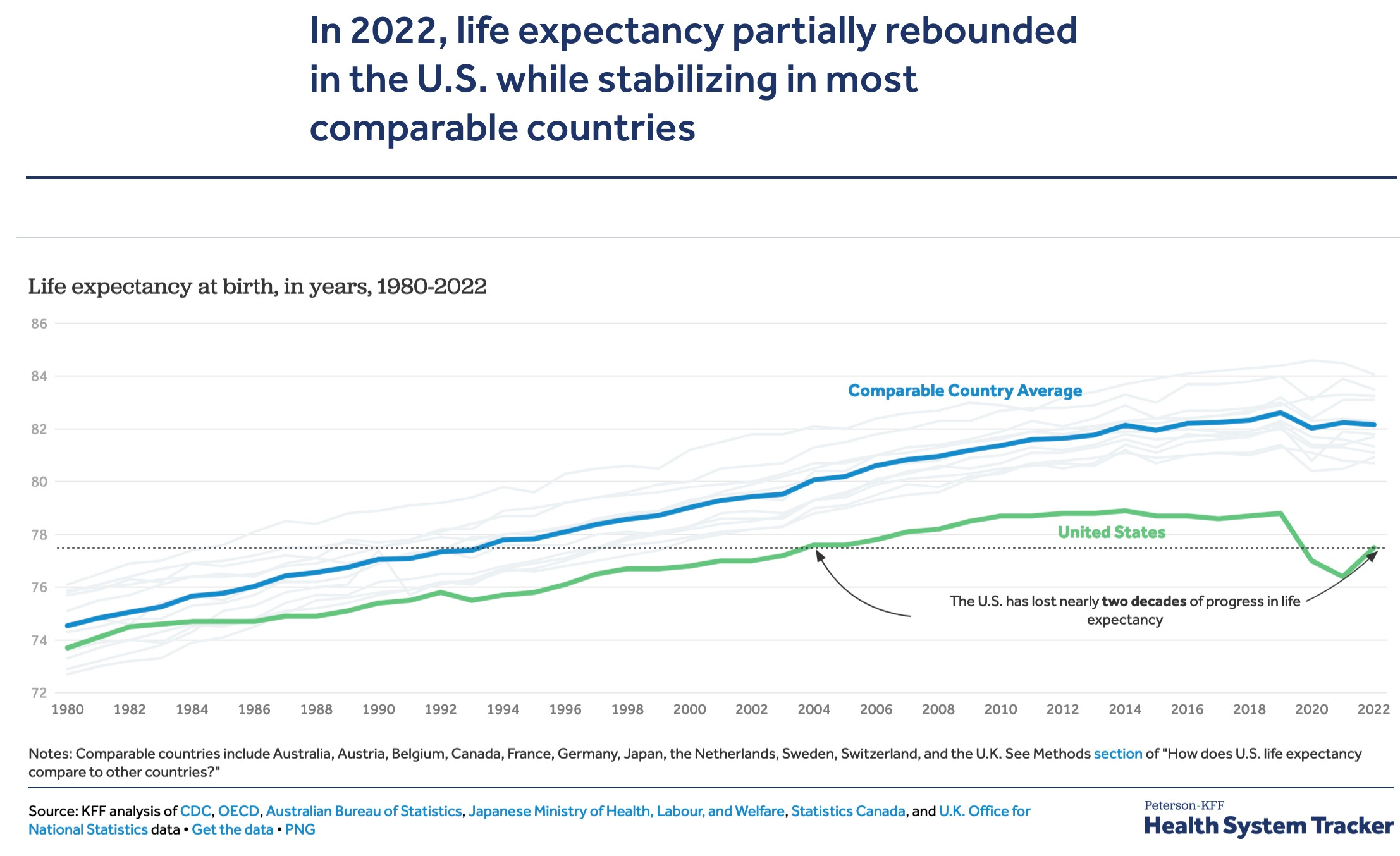 We had poorer life expectancy than our peer nations for over 40 years, but the gap has just kept growing over time, as we threw more pills at our population and offered Americans bad food and few good choices.