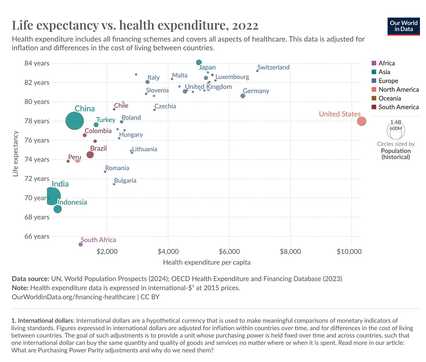 Thanks to Thomas Braun for finding this graph: We have the same life expectancy as China in this one but we spend ten times as much on health!