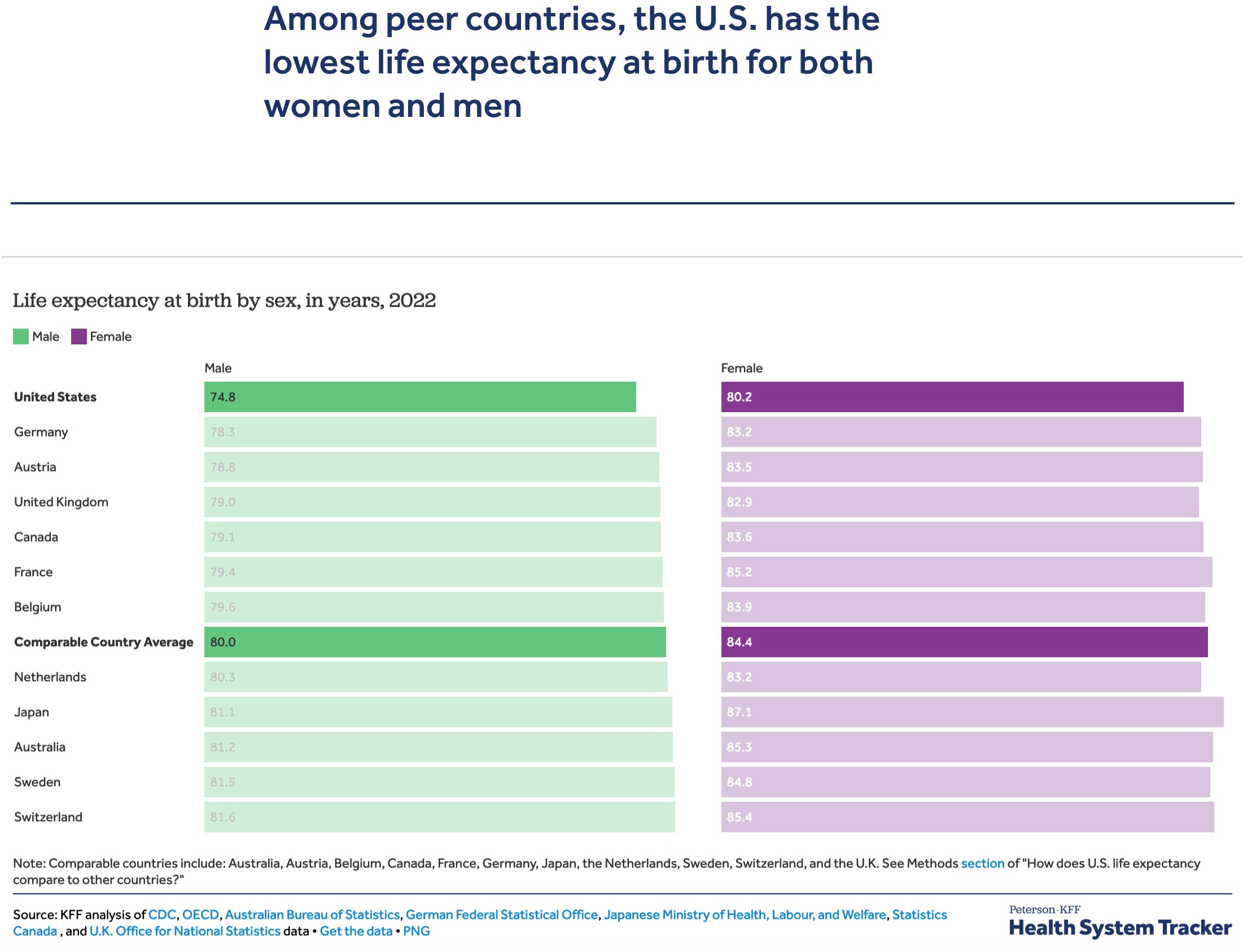 This graph from the Kaiser Family Foundation reveals our deficit in life expectancy did not start recently.