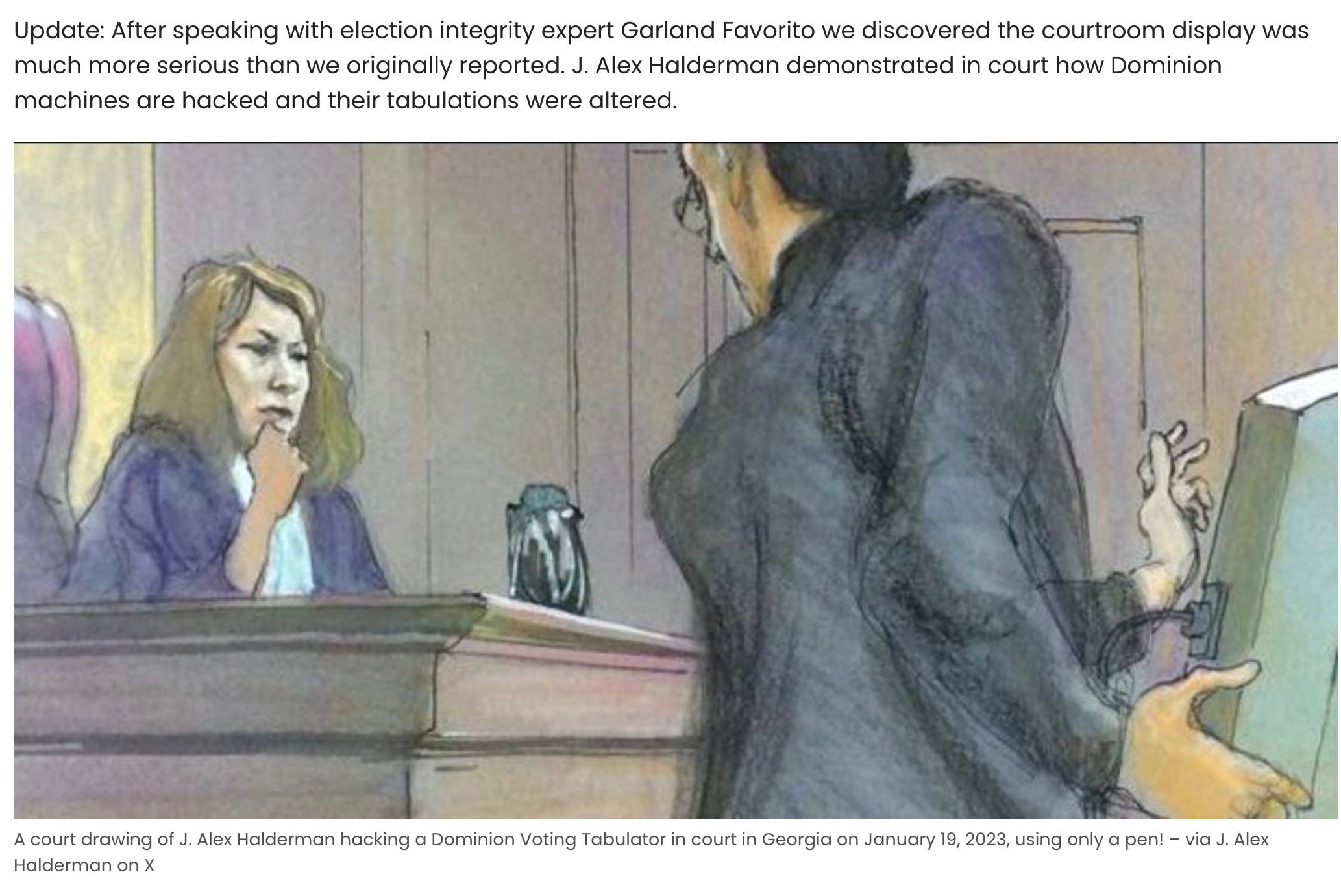 As best I can figure from Jim Hoft’s reporting, Georgia Secretary of State Raffensberger released a redacted report from the U Mich security expert last June, but the full report is now available. But Hoft did not link to it. Maybe I am too tired to figure out this story. But the story of voting machines getting into a courtroom and being hacked in front of a judge last January was to juicy for me not to share.