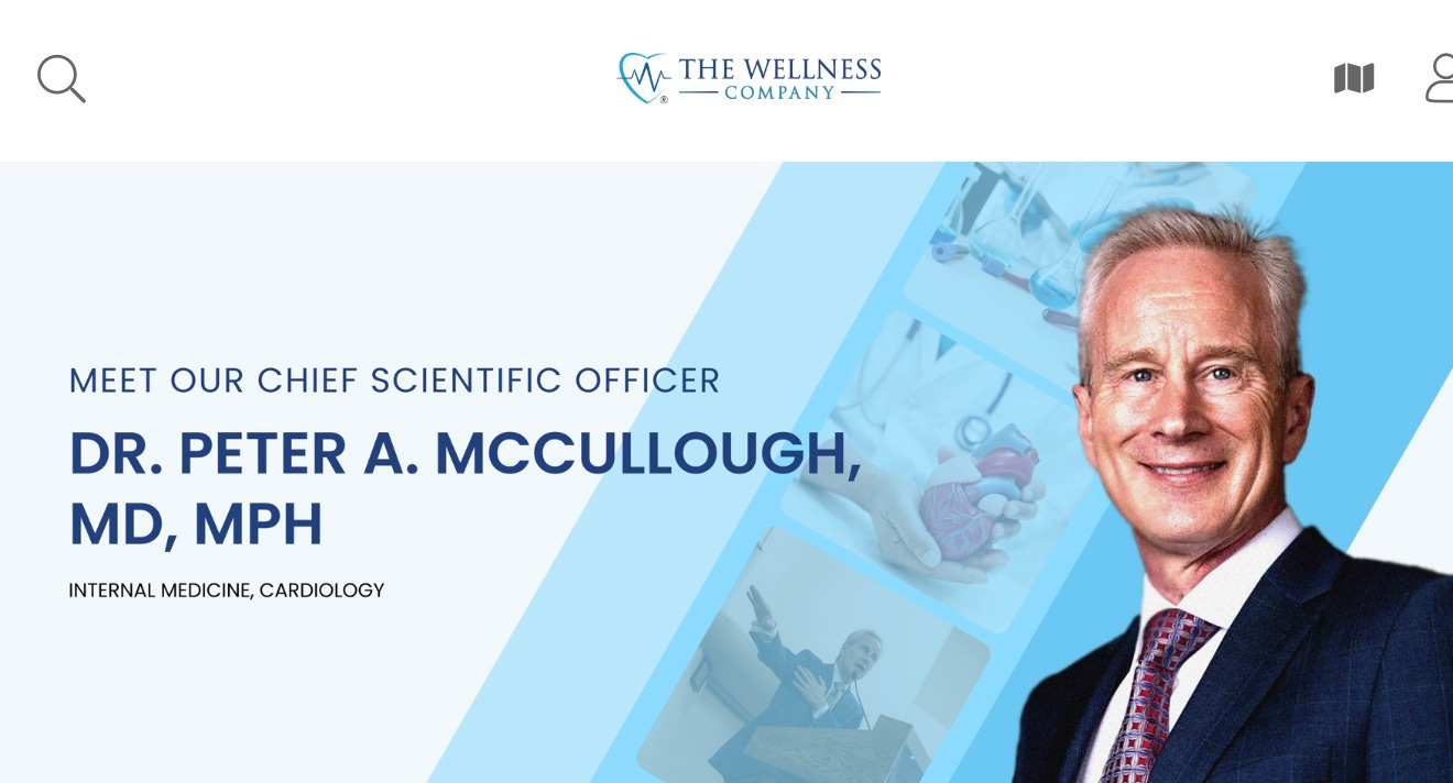 Dr. Peter McCullough has an interview out today with John Solomon on Real America’s Voice. Both the channel and Dr. McCullough are financially tied to The Wellness Company. Dr. McCullough is its Chief Scientific Officer.