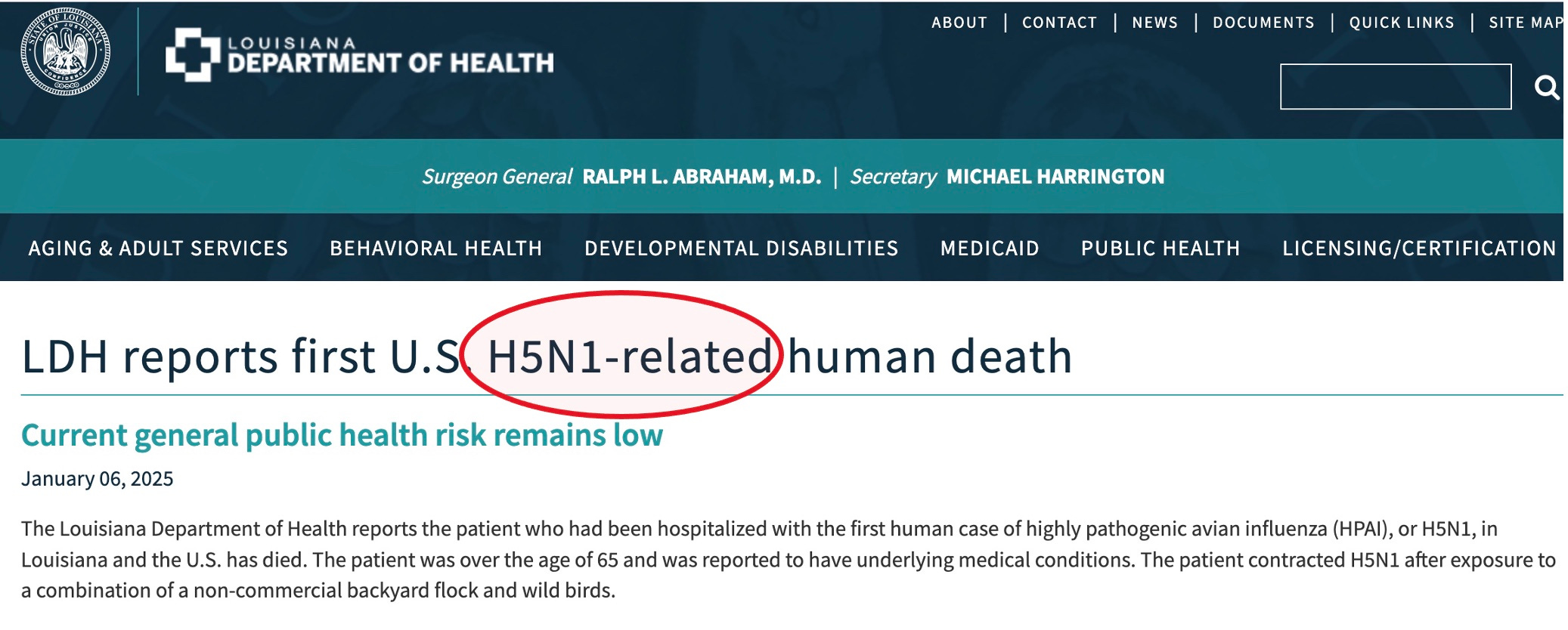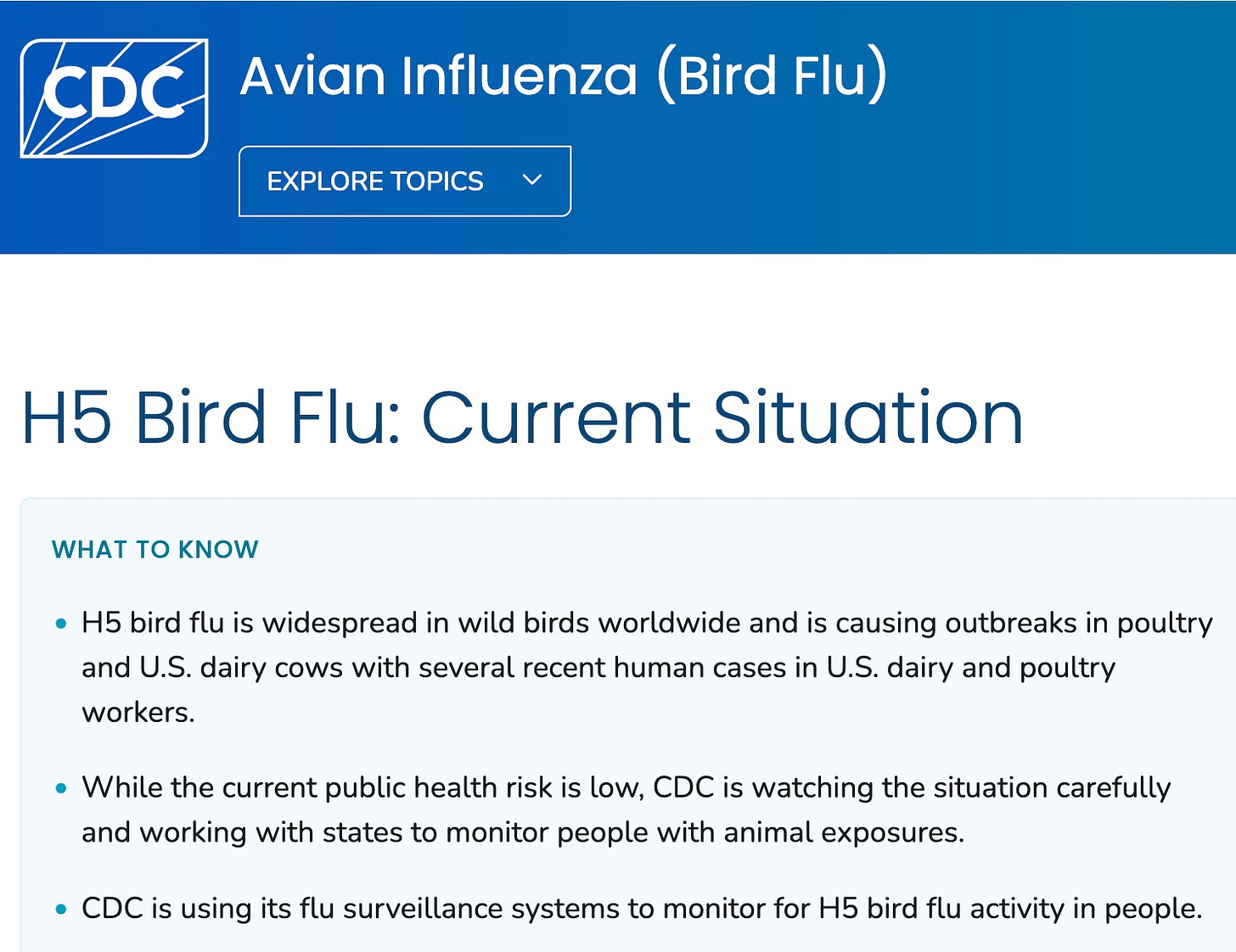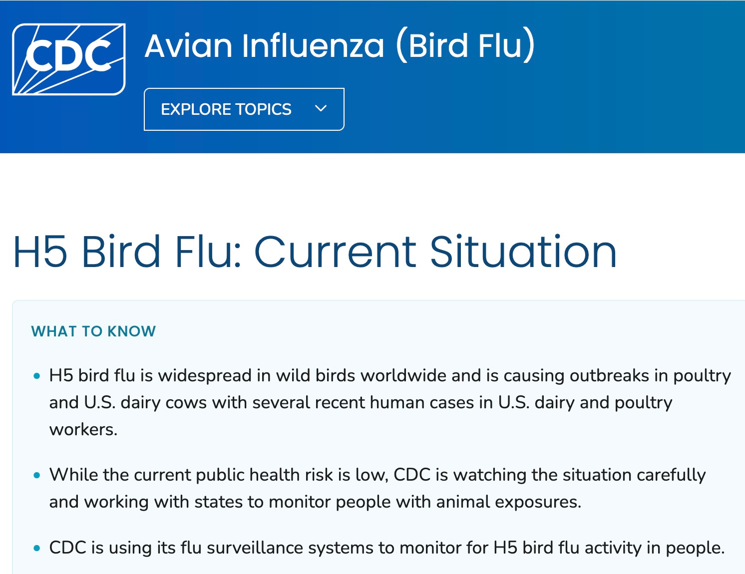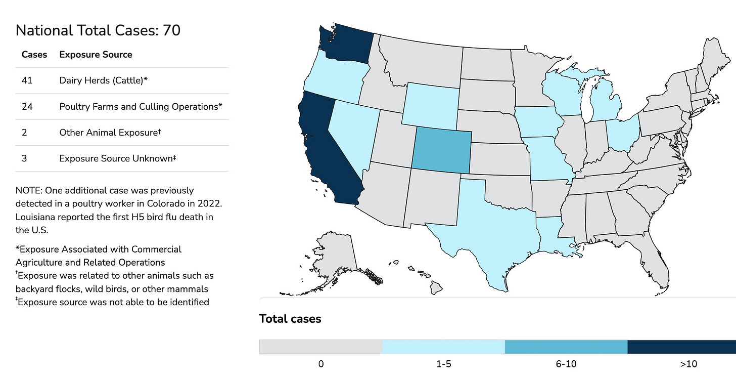 According to the CDC, 70 Americans have had bird flu in the US—ever. That number has not changed in 3 or 4 weeks. One got really sick and died, but it is not clear if it was due to bird flu. The Louisiana health department was agnostic about the cause of death, stating it was related to bird flu but not due to bird flu: