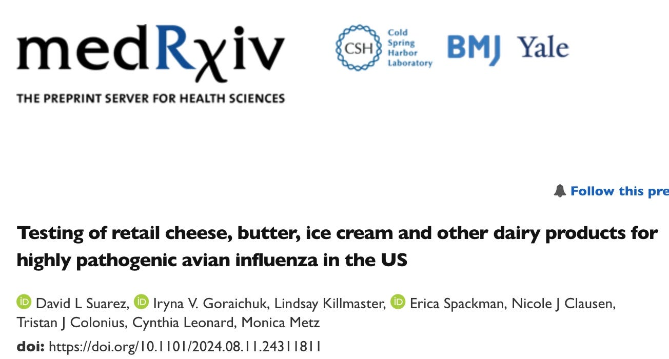 FDA and USDA: 20.1% of 144 pasteurized dairy products were PCR + for bird flu with no live virus, while NONE of 23 raw milk cheeses were PCR + nor grew live virus