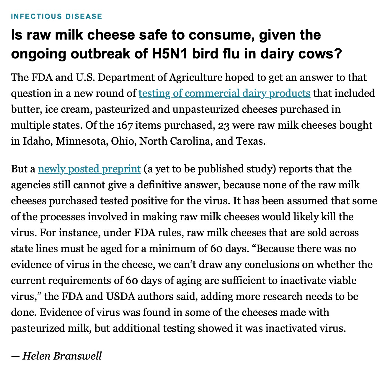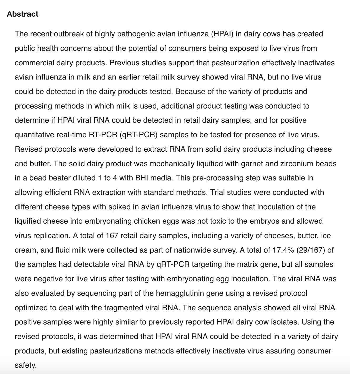 FDA and USDA purchased and tested 144 pasteurized dairy products and 23 raw milk cheeses from around the US with quantitative real time reverse transcription PCR tests seeking evidence of HPAI bird flu viruses. The PCR test only looks for a small, nonviable segment of virus, in this case part of the matrix gene.