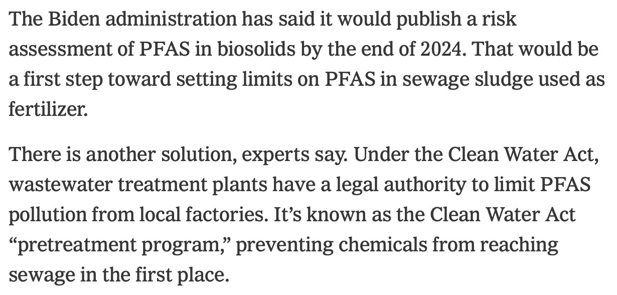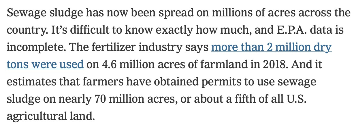 "Forever chemicals" (carcinogens, neourotoxics, mutagens, etc.) in sewage sludge may have been spread on up to 20% of US farmland due to EPA intransigence