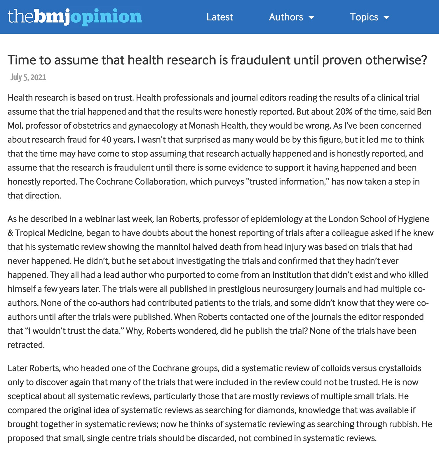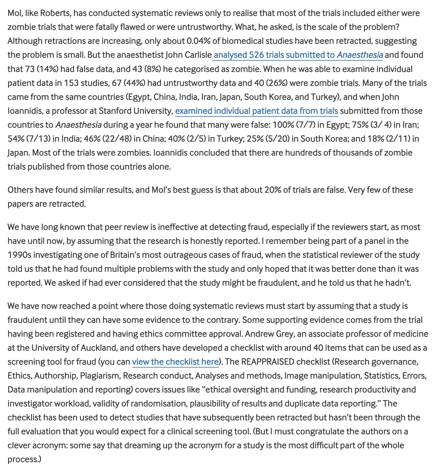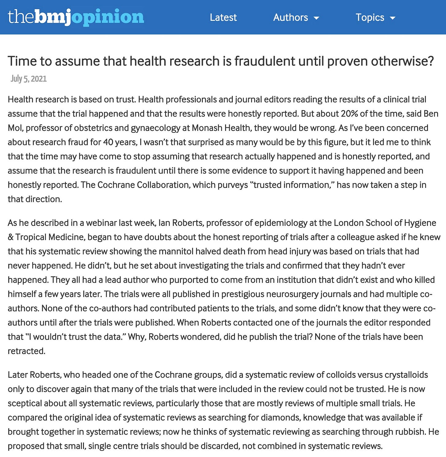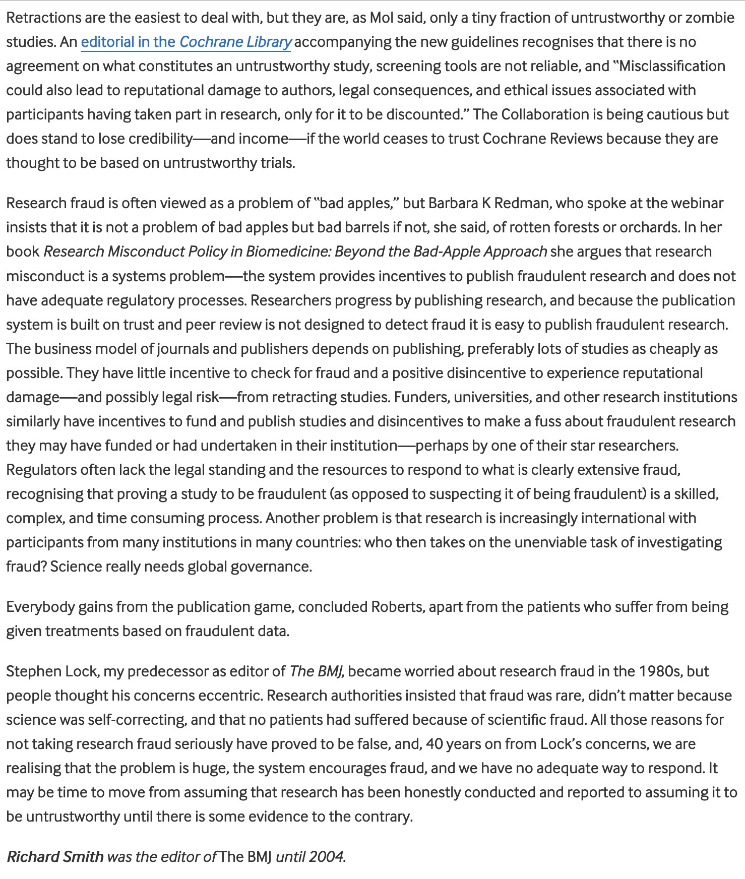 "It is simply no longer possible to believe much of the clinical research that is published, or to rely on the judgment of trusted physicians or authoritative medical guidelines. I take no pleasure in this conclusion, which I reached slowly and reluctantly over my two decades as an editor of The New England Journal of Medicine." Dr. Marcia Angell