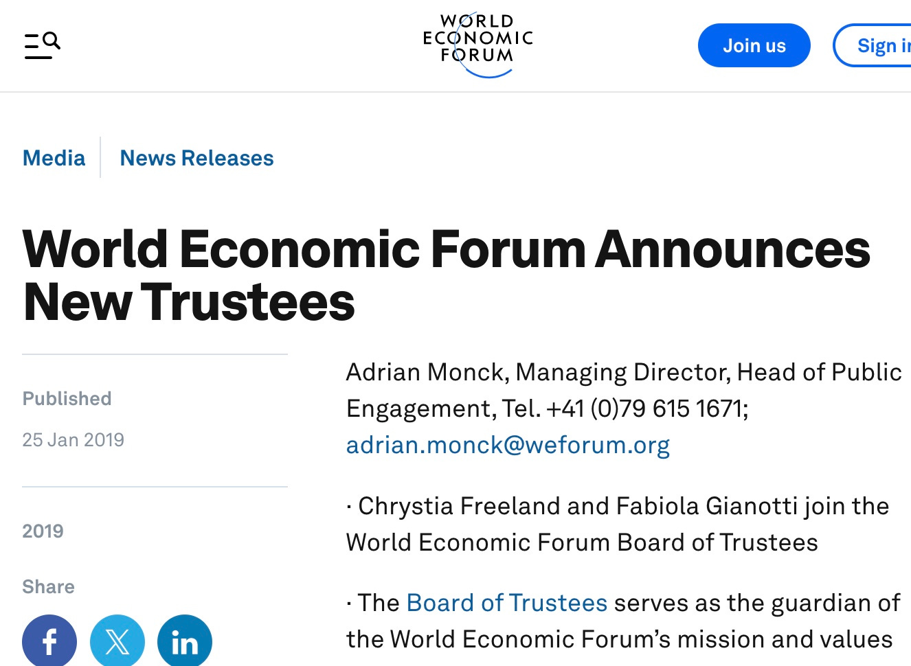 Chrystia Freeland, until yesterday the Deputy Canadian Prime Minister and Finance Minister, sits on the WEF Board of Trustees.