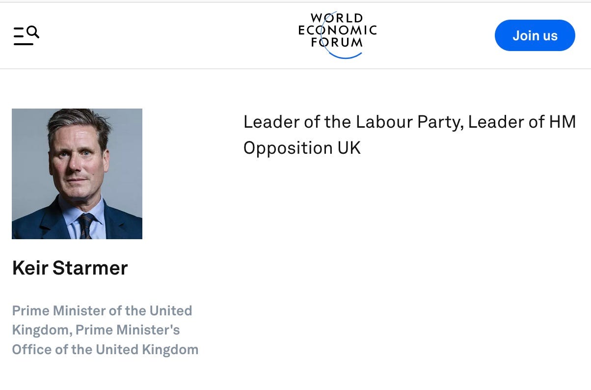 Keir Starmer, UK PM, teetering with the lowest approval rating of any PM in the UK’s history, was not a Young Global Leader, but only a WEF sycophant and speaker: