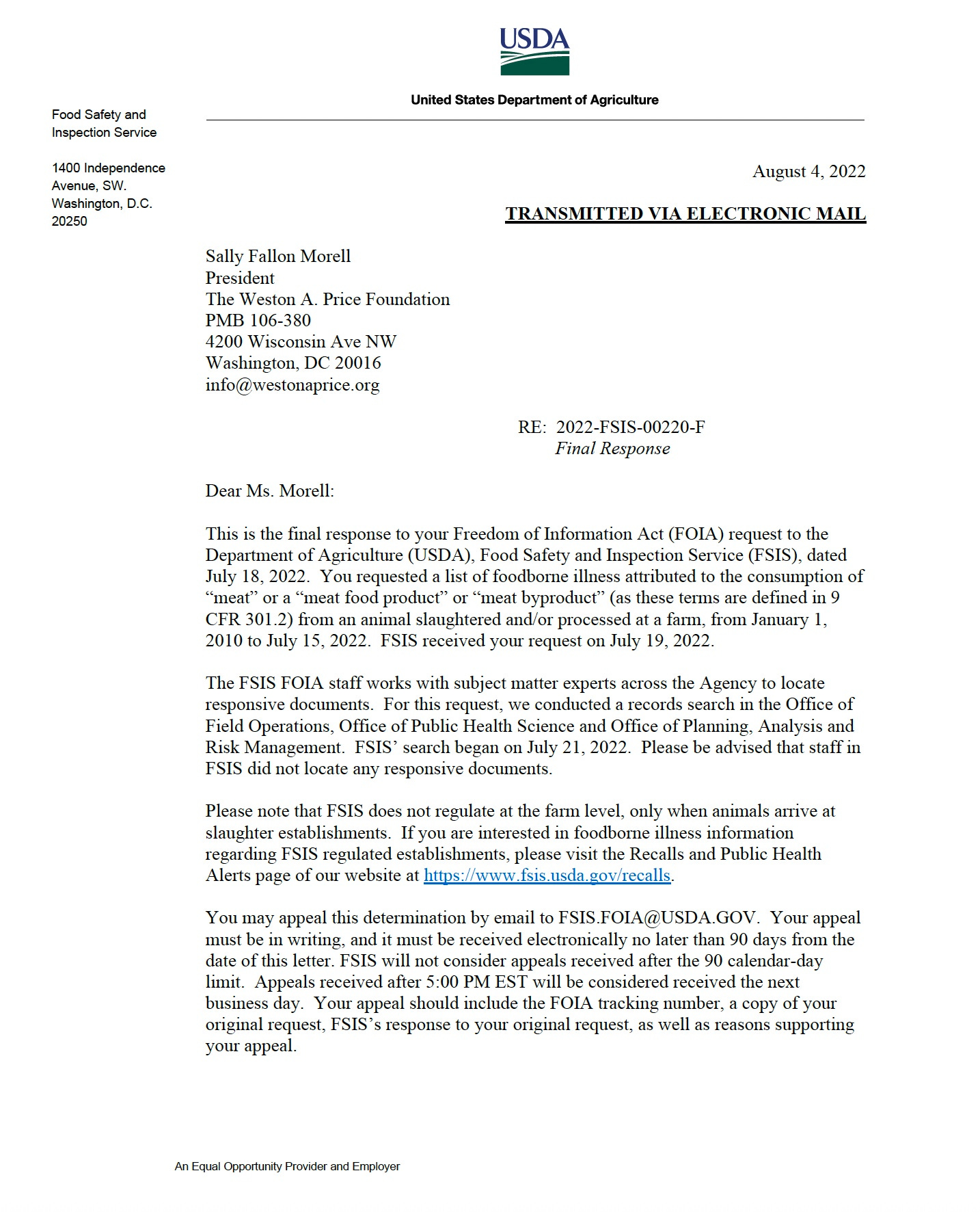 c. When USDA’s Food Safety and Inspection Service (FSIS) was recently asked to provide lists of cases of foodborne illness attributable to slaughter and processing of meat both on-farm and in custom slaughterhouses over a period of roughly ten years, the FSIS could not identify a single report of any such illness in the entire US. See the 2 FSIS responses attached.