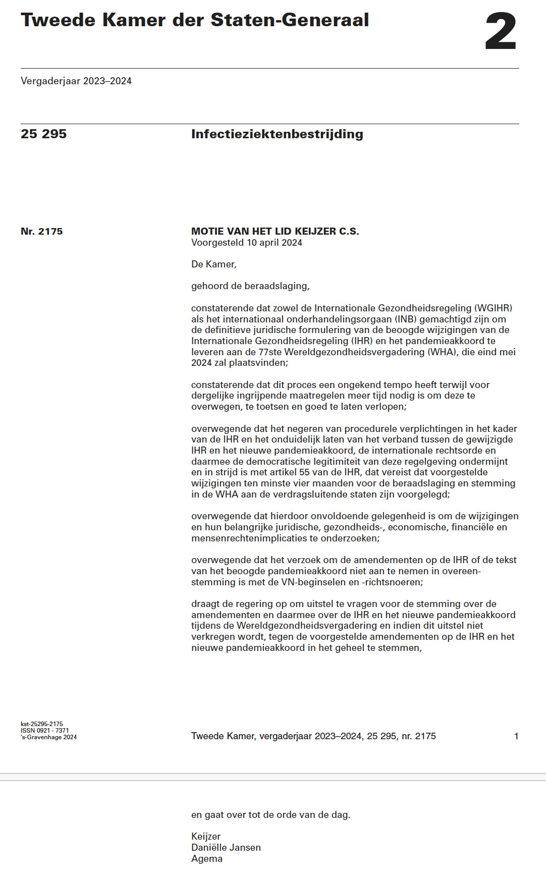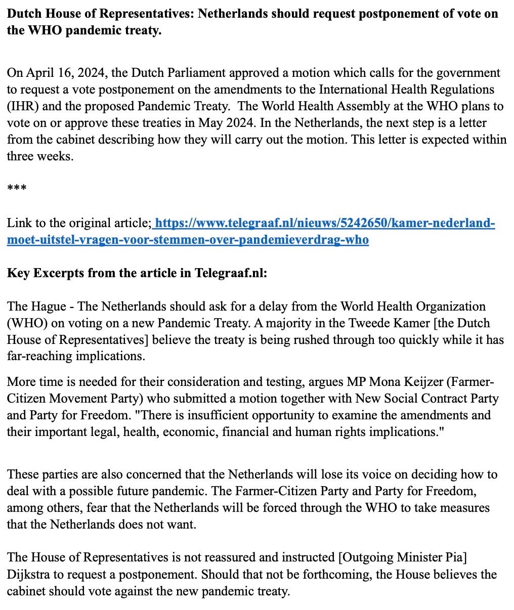 HOT! Today Dutch Parliament Votes to Instruct the Government to Demand a Delay in both WHO votes--and if no delay, to vote against the proposals