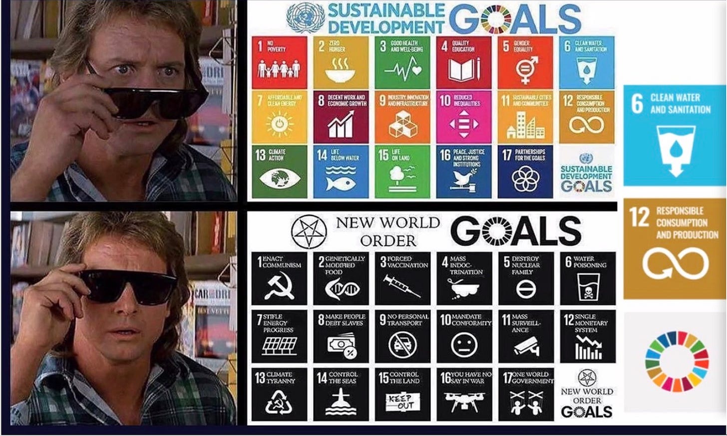 This graphic, with the person on the left taken from the movie “They Live,” where you could only detect the aliens when you looked at the world through sunglasses, is an interesting take on those Sustainable Development Goals… that have been shoved down our throats without us ever being asked to acquiesce. Maybe he sees what they really are?