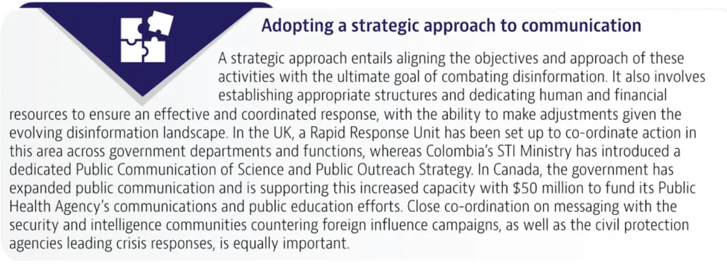 The OECD repeated the identical buzzwords used in the US, including ‘whole of society,’ and ‘infodemic,’ and it shares the definition of mis, dis and malinformation with the US’ Department of Homeland Security. Here are a few sentences, but the OECD misinfo website is worth a look, as it is more explicit and thereby more transparent than the USG misinformation websites. For example: