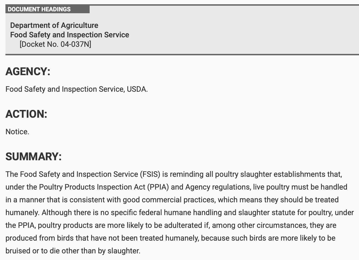USDA's Federal Register Notice "Treatment of Live Poultry Before Slaughter" states that the Poultry Products Inspection Act (PPIA) (21 U.S.C. § 451 et seq. (2022)) ensures humane slaughter of the birds. The PPIA and its regulations require that live poultry be handled using good commercial practices and that they not die from anything other than slaughter after arriving at the slaughter facility. Since poultry are protected under the PPIA, they are not included under the HMSA.