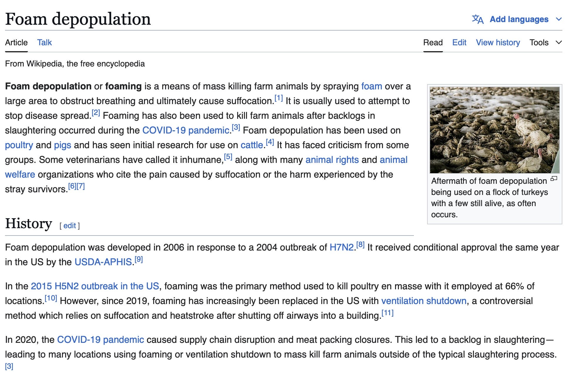 The bird flu program has been run by cruel dolts. One of its effects is to normalize animal genocide, and to cull birds in particularly horrible and painful ways. Some methods being used are banned for culling livestock, but somehow birds were not included in the law for livestock.