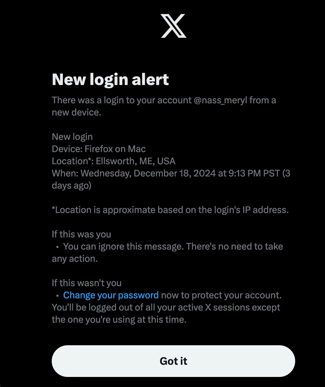 Later I received the following message from Twitter, which if anything confirms that I had never previously used the minor twitter account on my computer.