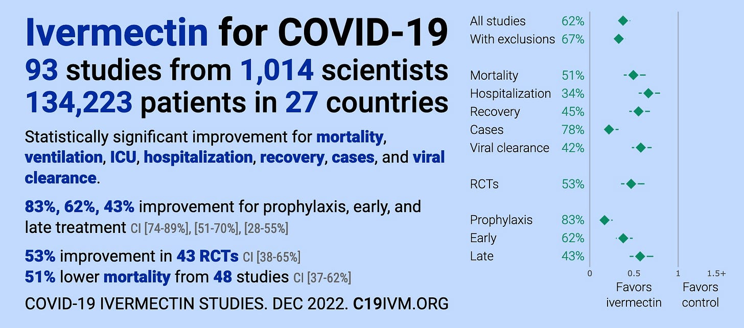 Here is the wonderful compilation of all studies of ivermectin for covid, and at the c19study.com website you can look up all studies on all major COVID treatment s being used. No matter how these studies are sliced and diced, they show the drug’s benefit: