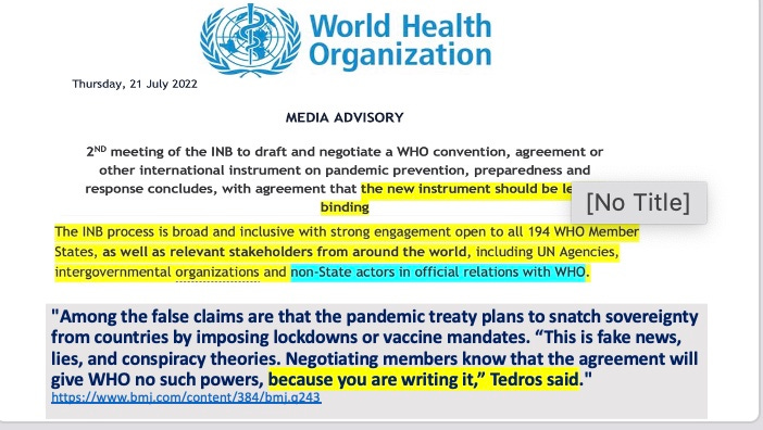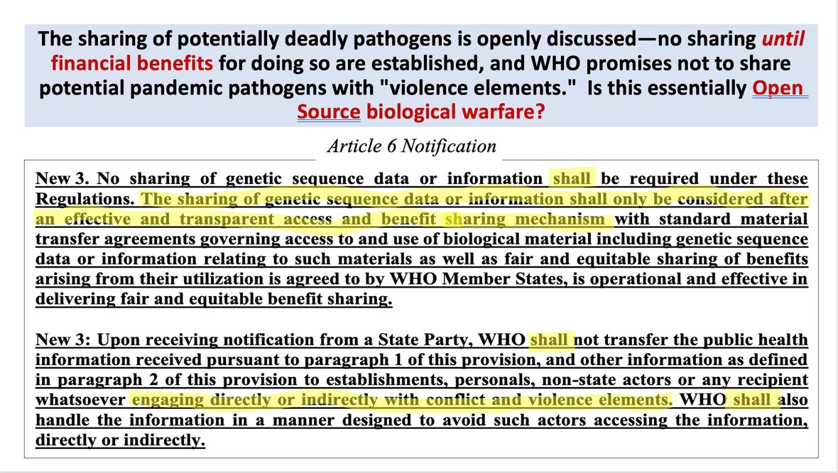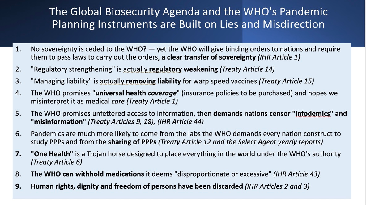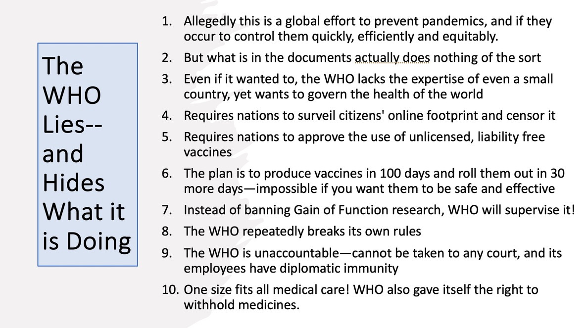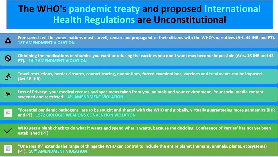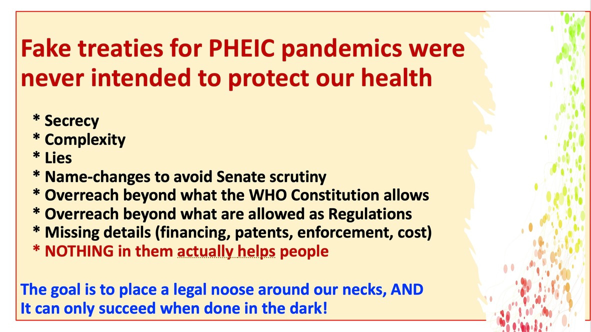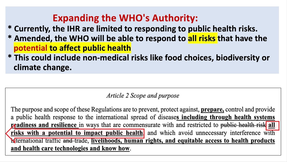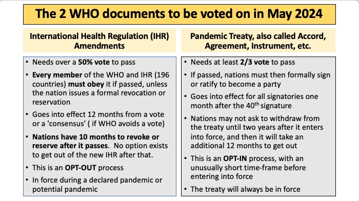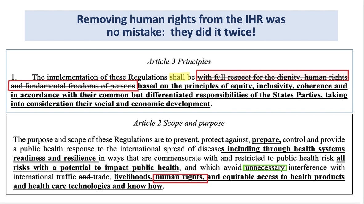 But I think people should ignore all the differences between the two WHO proposed treaties (currently titled the Pandemic Agreement and the IHR Amendments) because I believe they were created to generate the most confusion. They have overlapping provisions, and if either passes it will be a legal noose around our necks. The IHR Amendments are being negotiated with massive secrecy—presumably this is the one document they intend to ram through before people learn what is in it.