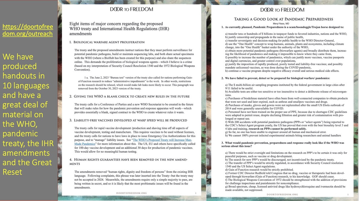 Here is where you can get information from a 1 page and 2 page handout on the WHO’s efforts and on the phony pandemic plan.