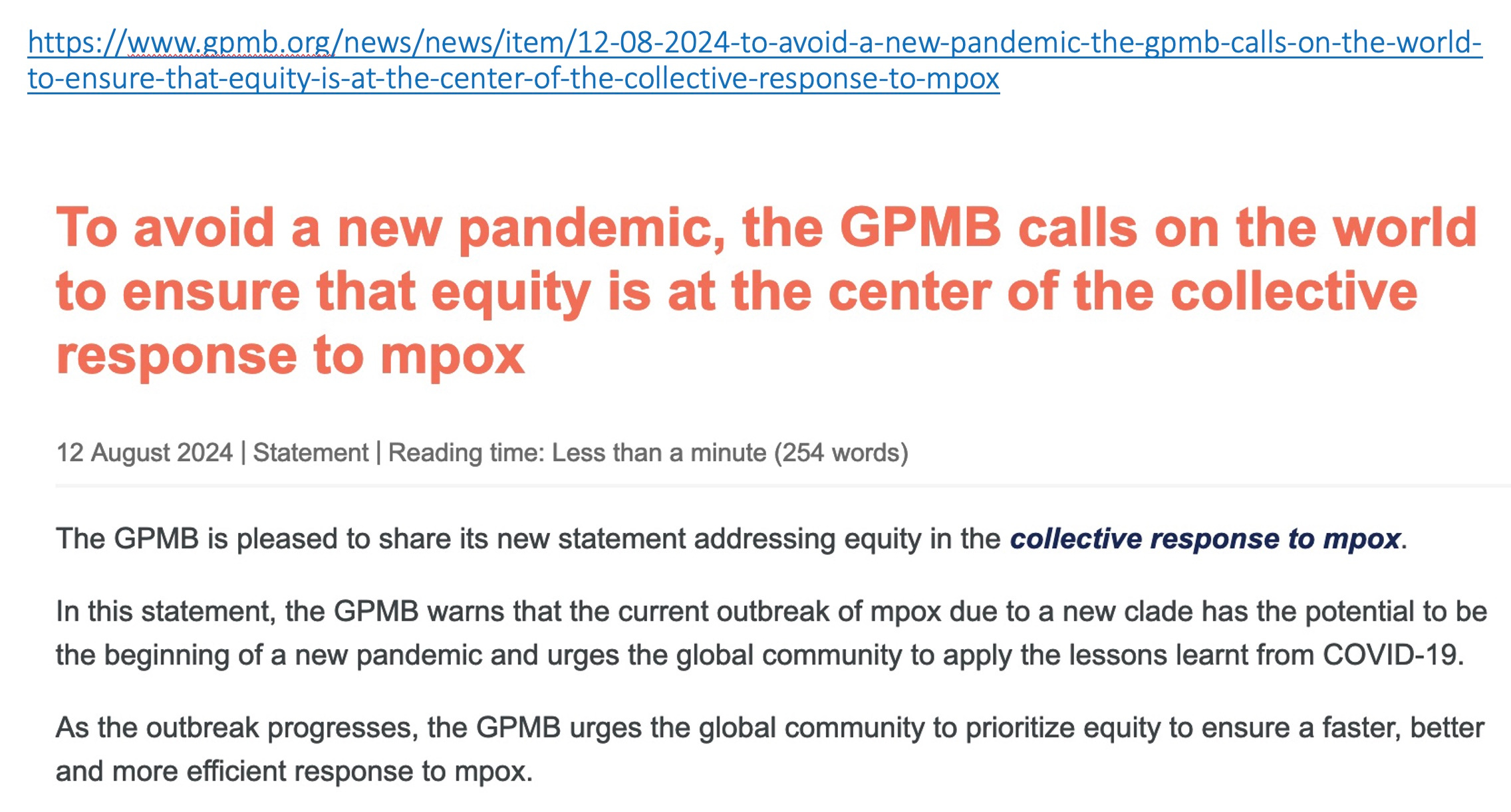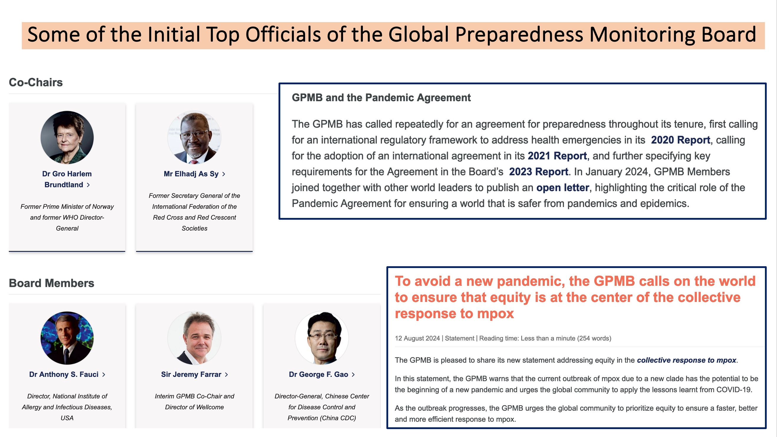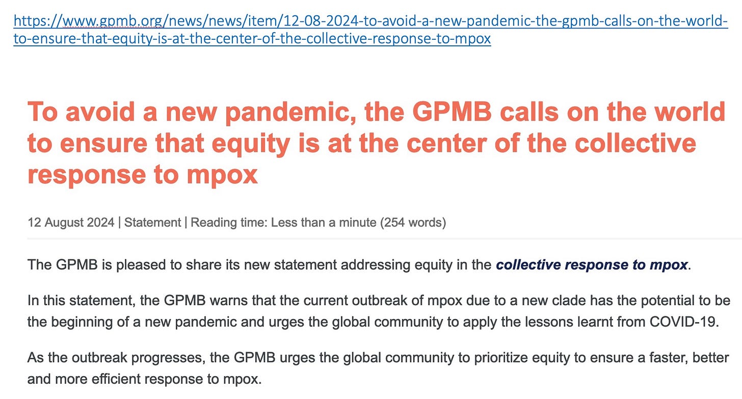 Those members moved on, though there remain some power players on the GPMB now. They are trying hard to stay relevant. Today they issued a report, which the WHO released. In August 2024 they tried to build up Monkeypox as a big threat requiring “equity,” i.e., vaccines for Africa, free and lots of them:
