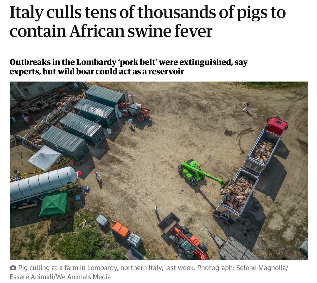 … Almost 34,000 pigs were culled in Italy last week after a cluster of outbreaks in Lombardy, a region known as Italy’s pork belt and one of Europe’s main pig-producing areas.