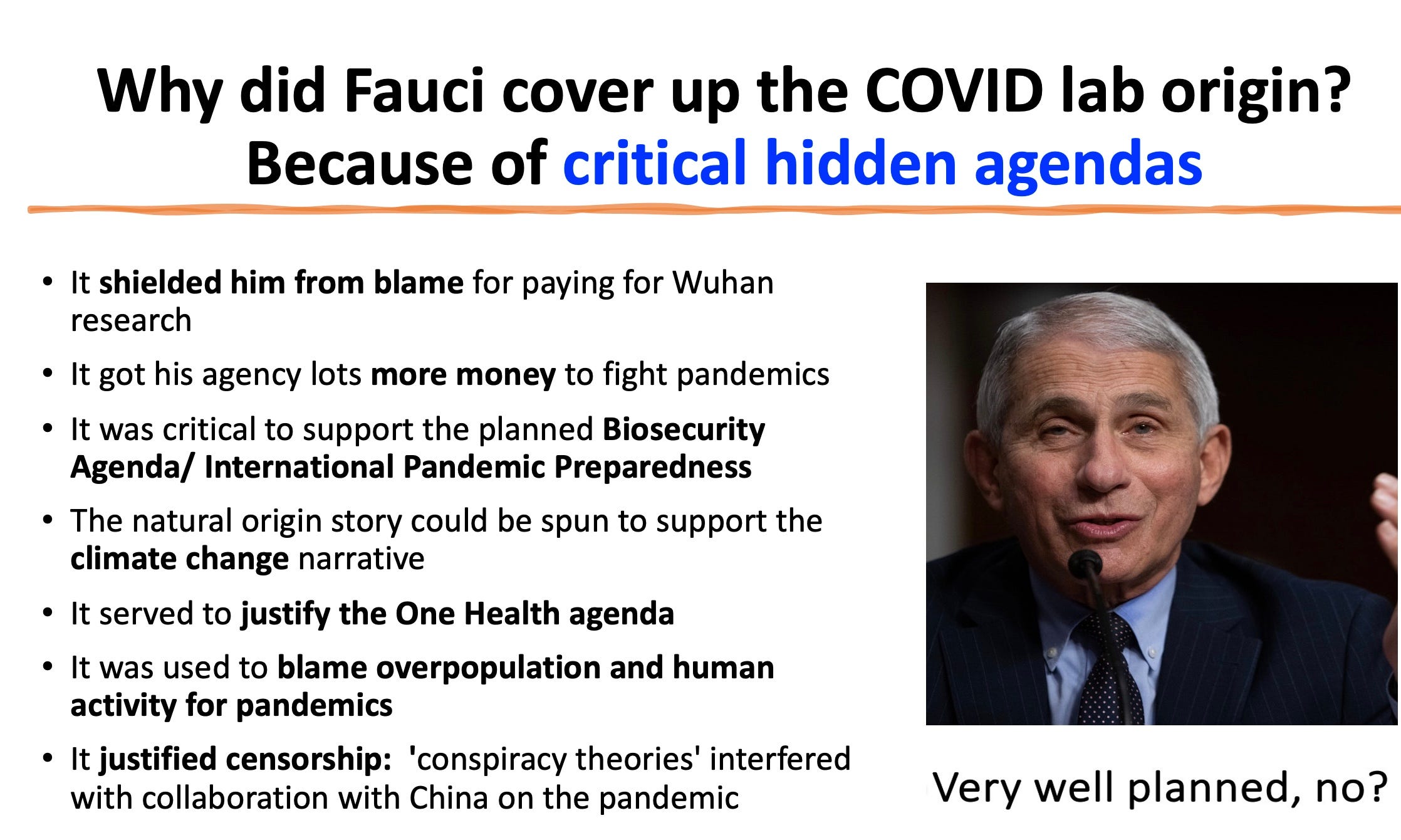 Why was a coverup by western scientists so critical? Because claiming that pandemics come from animals living in nature, and are spread to humans due to our incursions into their territory, was needed to justify the entire biosecurity agenda that the WHO is steamrolling over us.