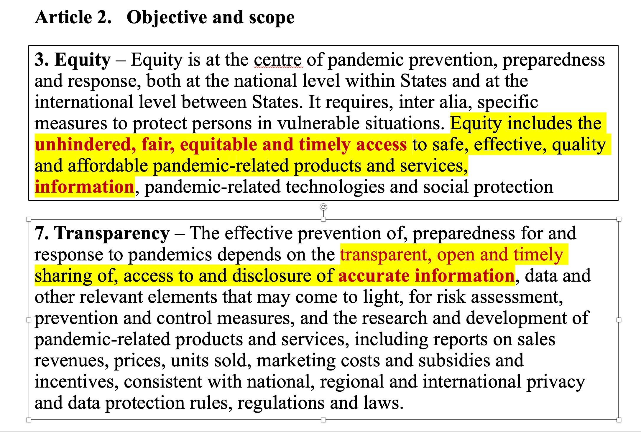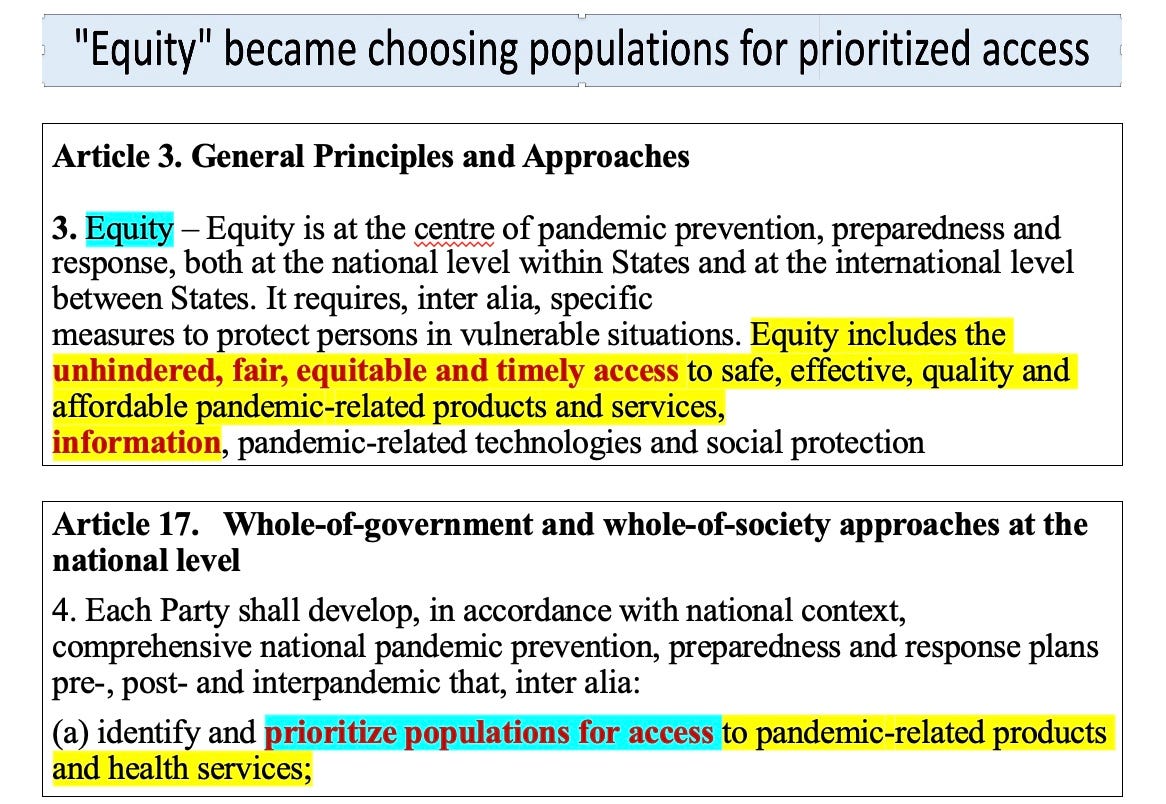 But these mellifluous phrases didn’t last long. By the time we reach the Article 17, equity has morphed into choosing who will get first dibs on pandemic products. Everyone is not equal after all.