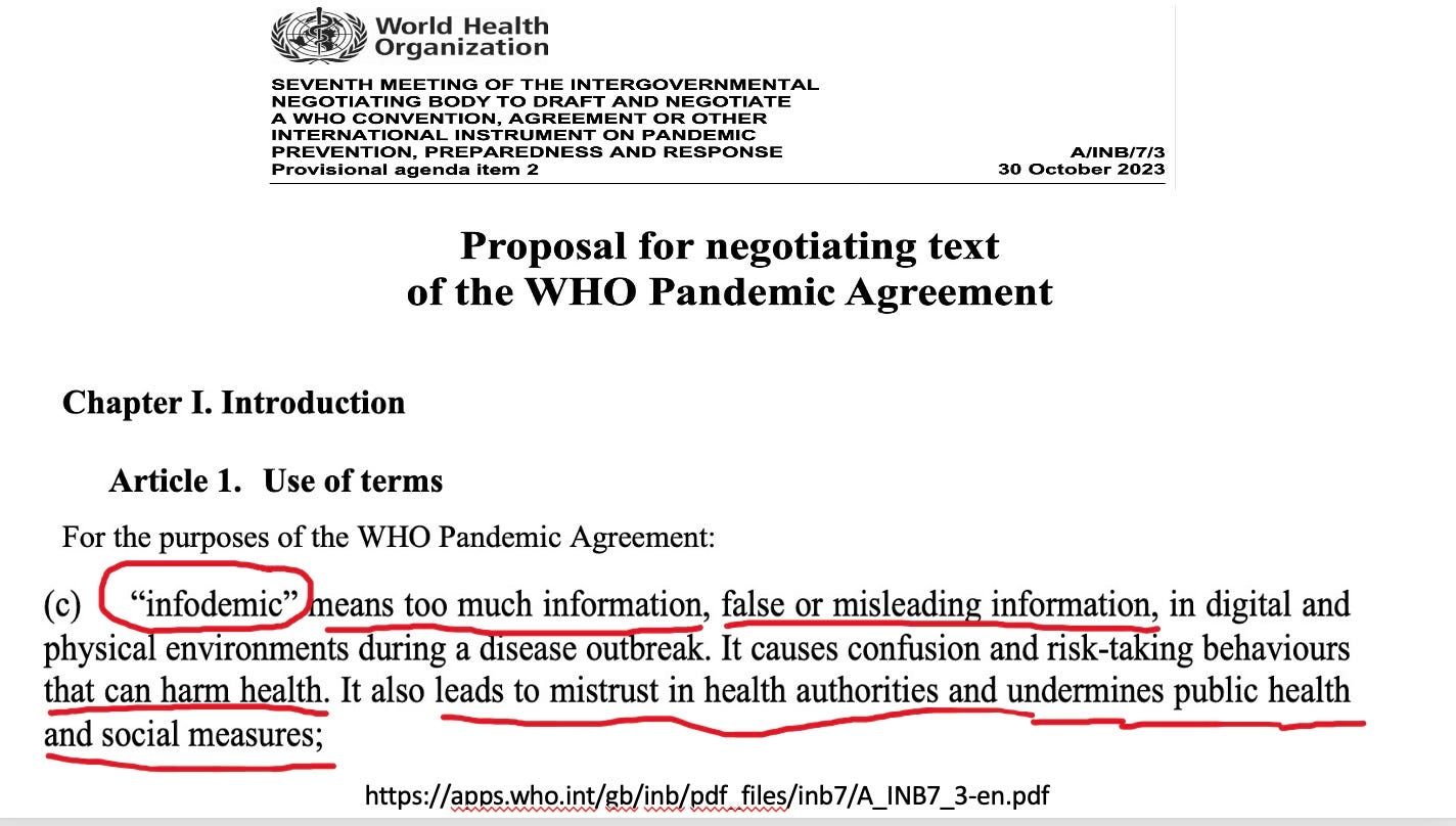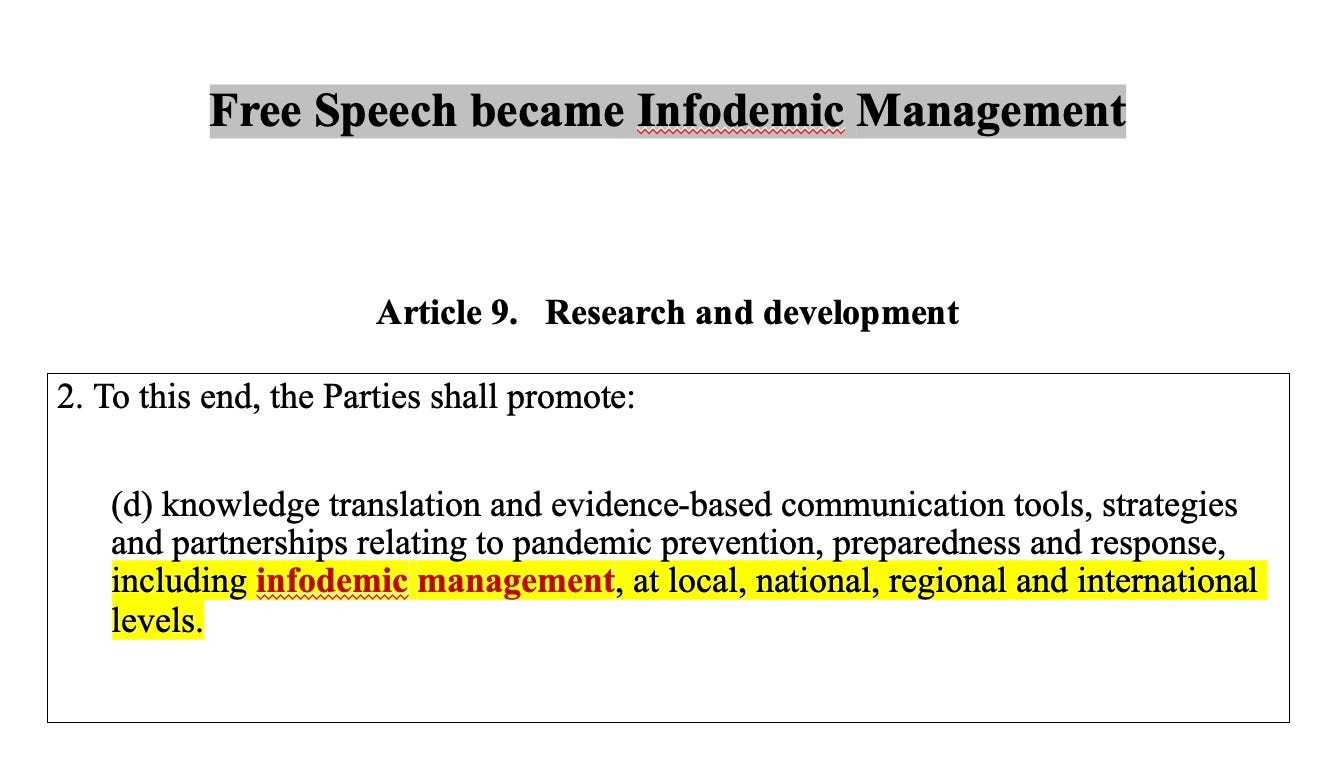 After promising free, full and fair access to information in earlier articles above, the WHO treaty yanks freedom of speech away. Everyone has to control infodemics (too much information or unwanted information) at the local, regional national and international level. That is some massive censorship project being contemplated…or perhaps already in place.