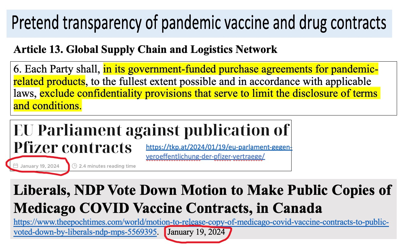 And here, the pandemic treaty promises transparency regarding government contracts for drugs and vaccines. Transparency! What a beautiful word. But guess what? It’s a charade. Because this very week, the European Parliament and the Canadian parliament voted to continue to hide the contracts for COVID vaccines from their citizens. Do you really think nations and the WHO will allow future pandemic vaccine contracts to be open to the public, when so many billions of dollars in gravy was involved, and no entity: not DOD, HHS or the so-called manufacturers wants to be held responsible for the resulting deaths and destruction?