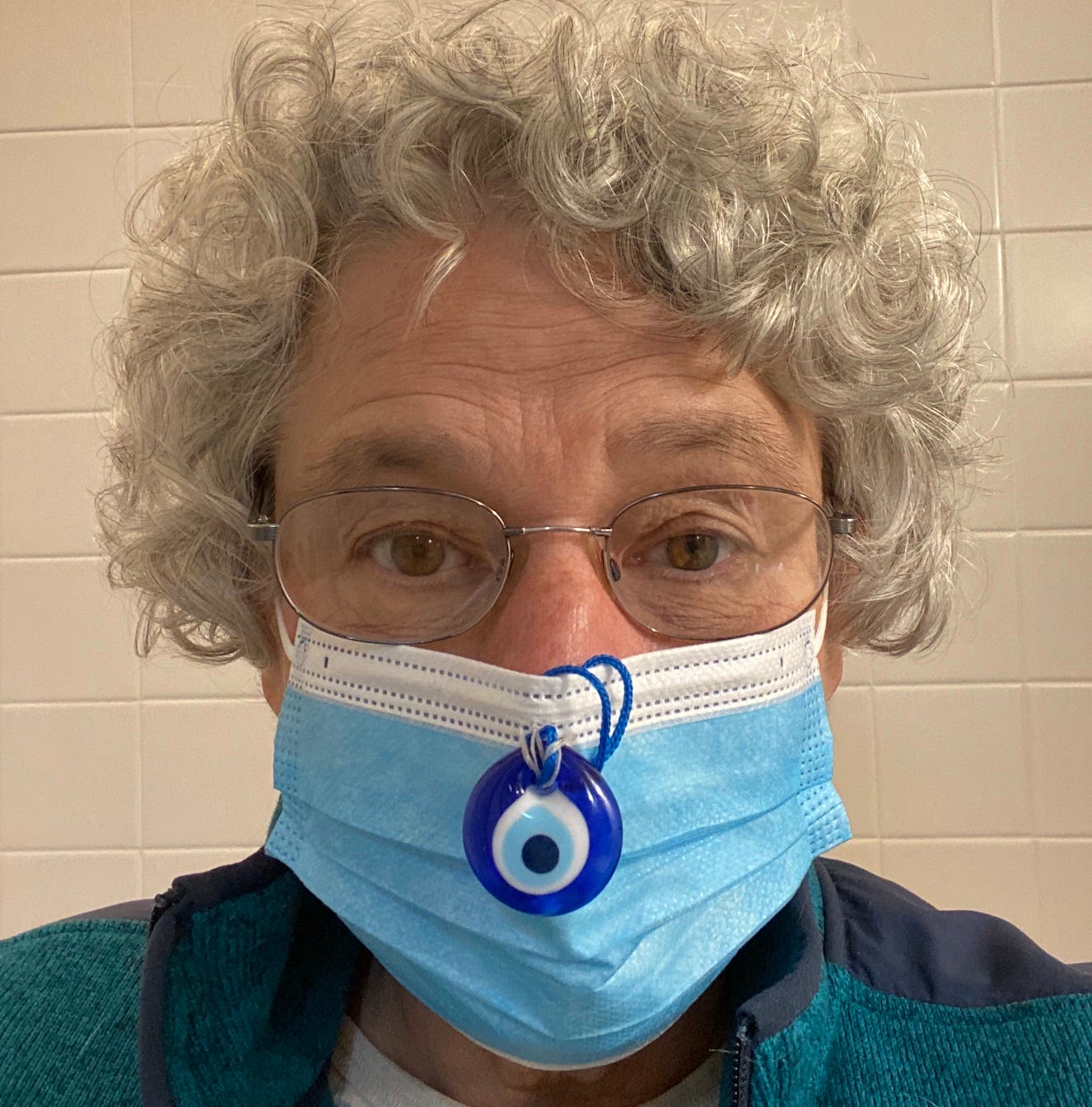 Another way to impinge on freedom of speech is to make speech barely intelligible. I tried several ways to tell a story when I was forced to wear a mask, but I don’t know how many people grasped my meaning. In this case, I sewed an “evil eye”talisman to my mask, trying to indicate that the mask was simply another talisman, trying to ward off the evil COVID through magic.