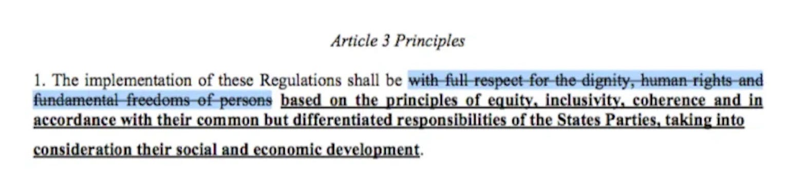 James is correct: all you really need to know is that full respect for human rights, dignity and freedom are being struck off, to be replaced with the undefined fuzzy “principles of equity, inclusivity and coherence…”